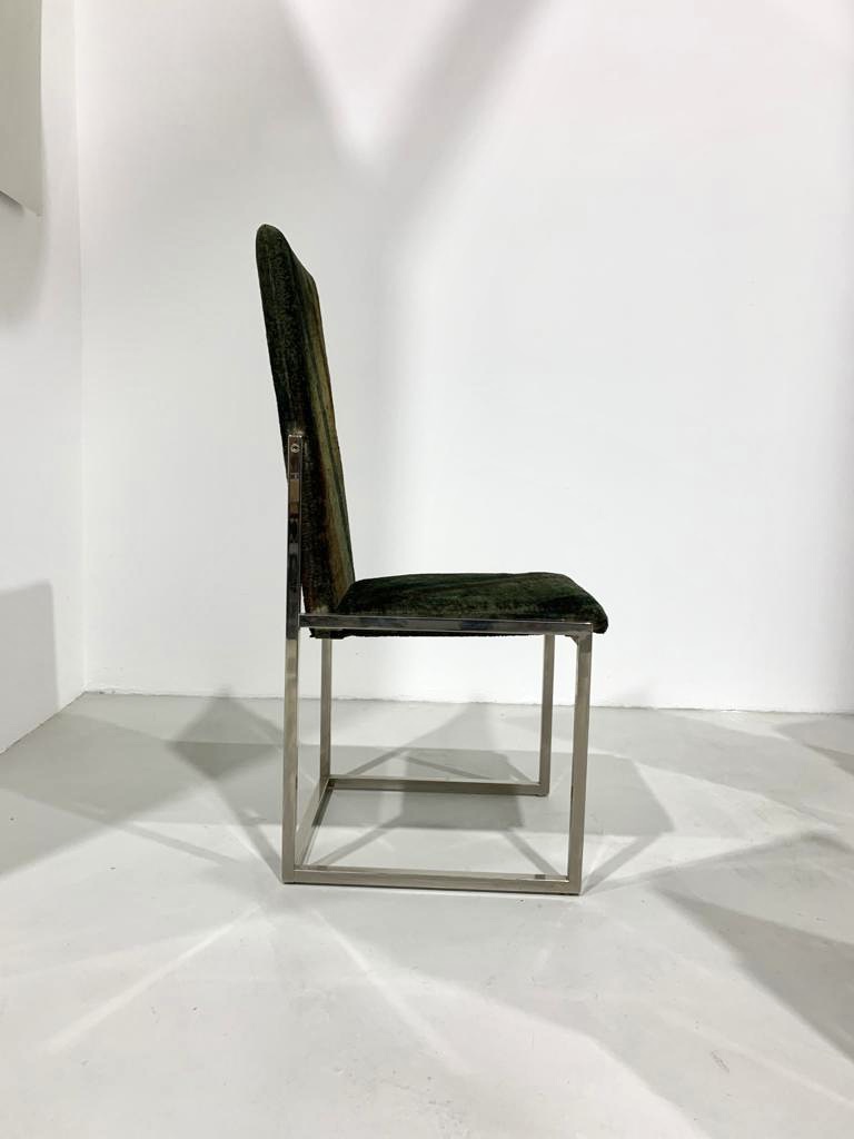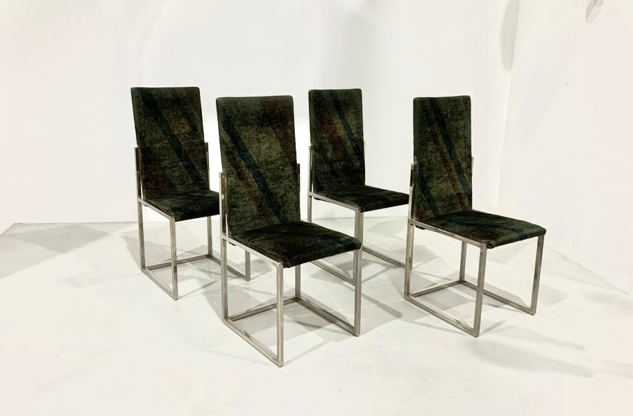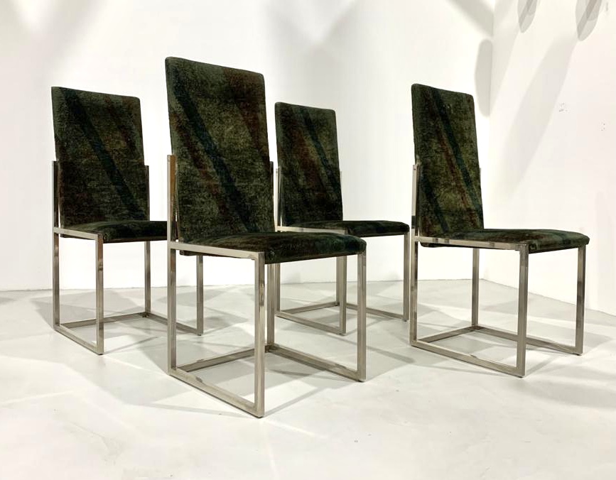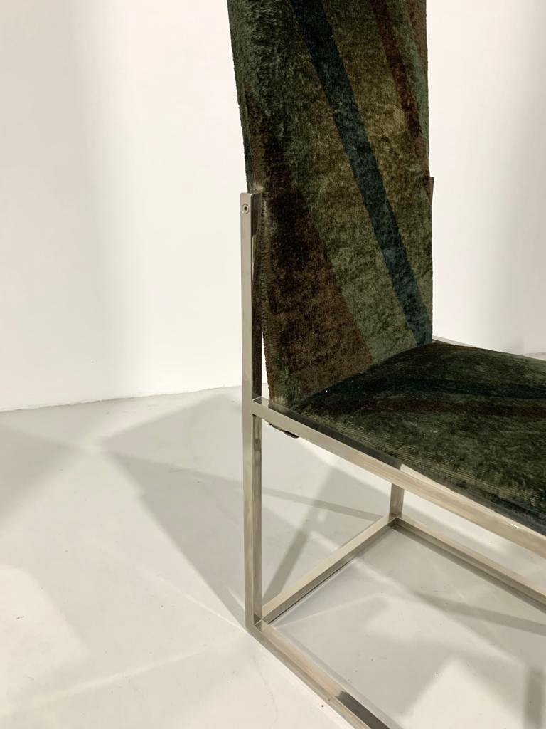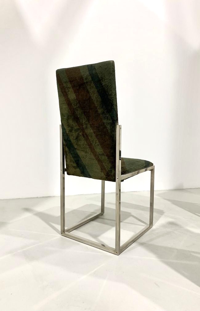Quattro sedie in velluto verde Missoni a righe diagonali rosse e blu. Anni '70. Mis. Lung. cm. 43 Alt. cm. 100 Prof. cm. 53 ca.