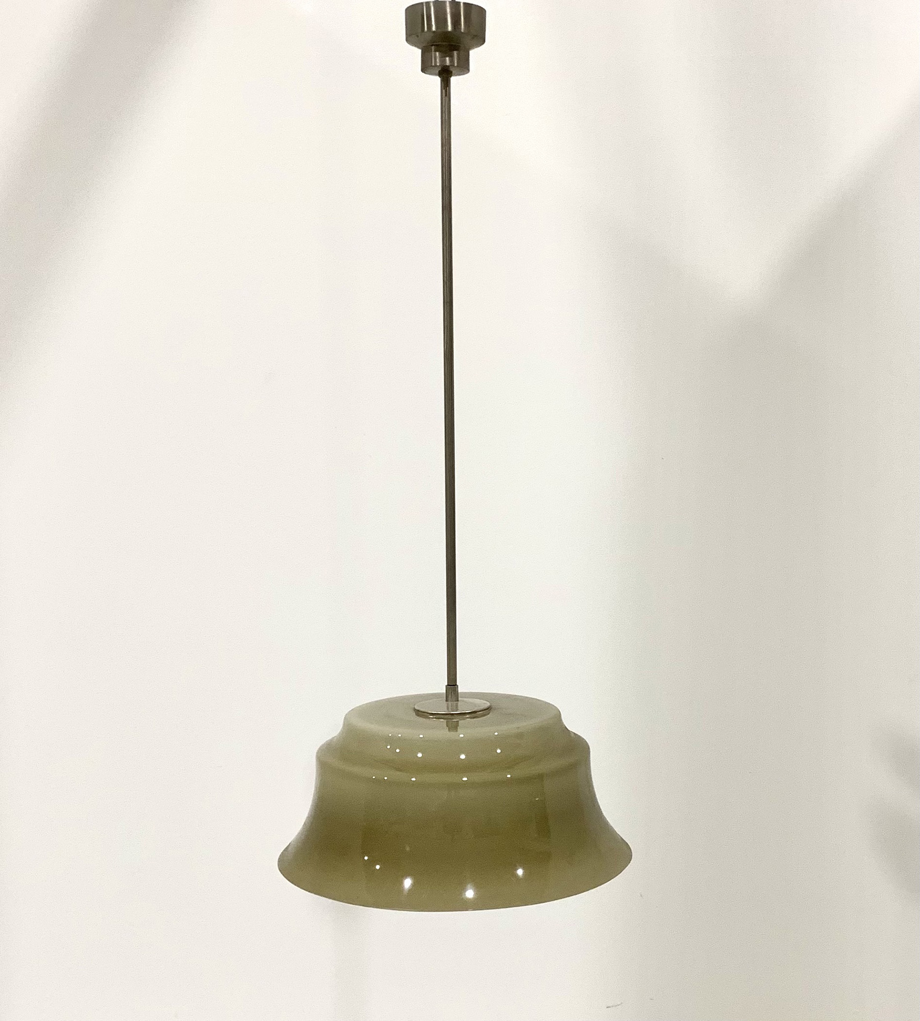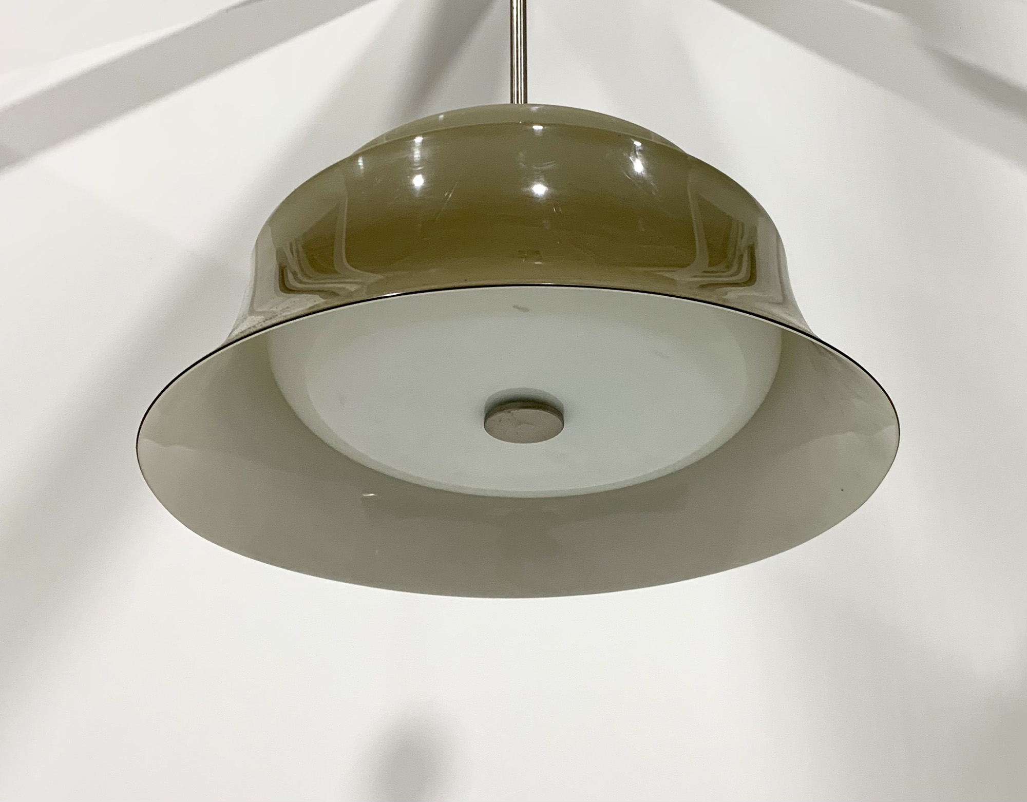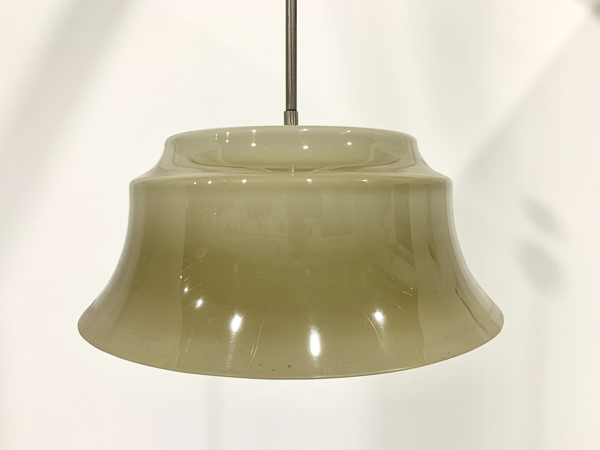 SERGIO ASTI (Milano, 1926 - 2021) e SERGIO FAVRE (1927-1967) per ARTEMIDE. Lampada a sospensione Merope con paralume in vetro e stelo nichelato. 1963. Mis. Alt. cm. 107 Diam. cm. 45 ca.