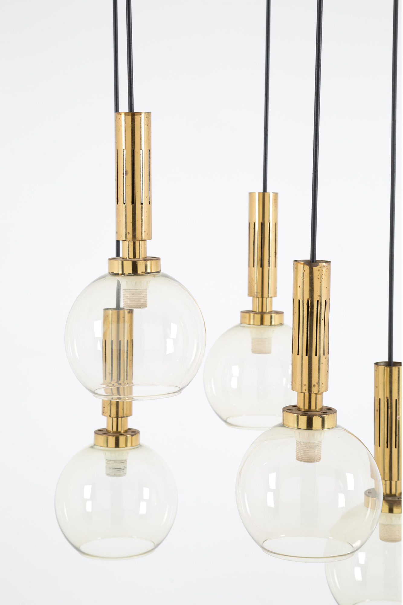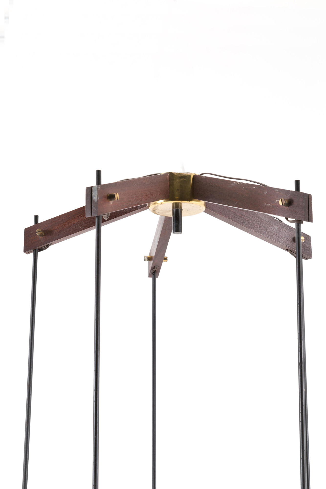 Lampadario cinque luci in vetro, ferro, ottone e legno. Produzione STILNOVO. Anni '50. Mis. Lung. cm. 50 Alt. cm. 115 Prof. cm. 50 ca.