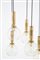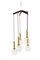 Lampadario cinque luci in vetro, ferro, ottone e legno. Produzione STILNOVO. Anni '50. Mis. Lung. cm. 50 Alt. cm. 115 Prof. cm. 50 ca.