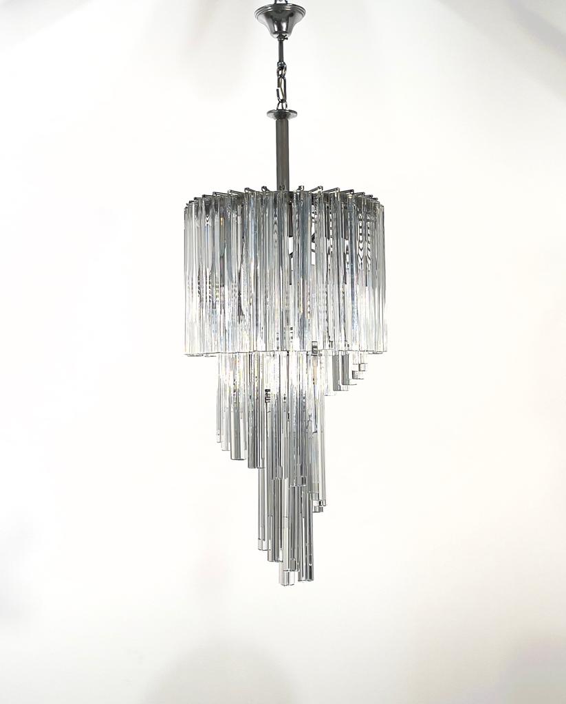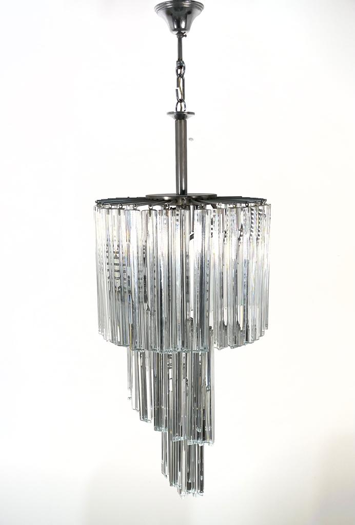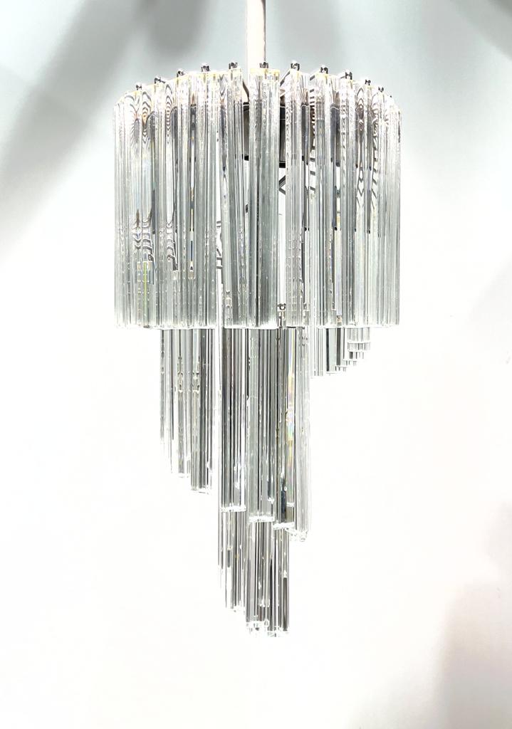 Lampadario Triedro in vetro di Murano e metallo cromato. Produzione VENINI. Anni '50. Mis. Alt. cm. 93 Diam. cm. 40 ca.