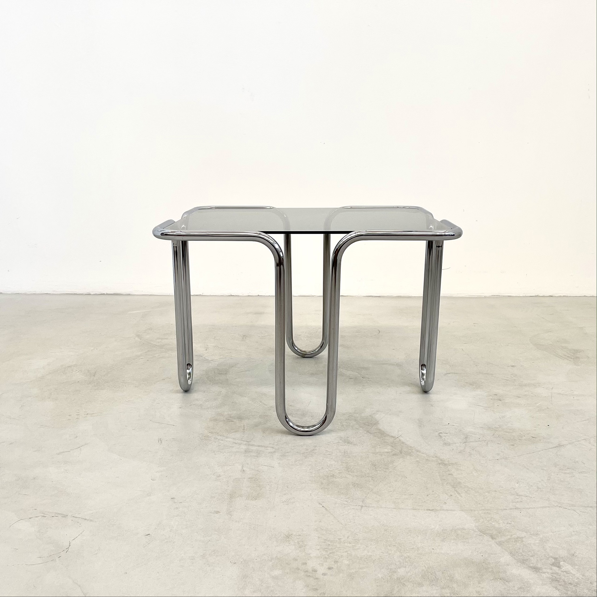 Tavolino da fumo in vetro e metallo cromato. Manifattura italiana. Anni '70. Mis. Lung. cm. 60 Alt. cm. 42 Prof. cm. 60 ca.