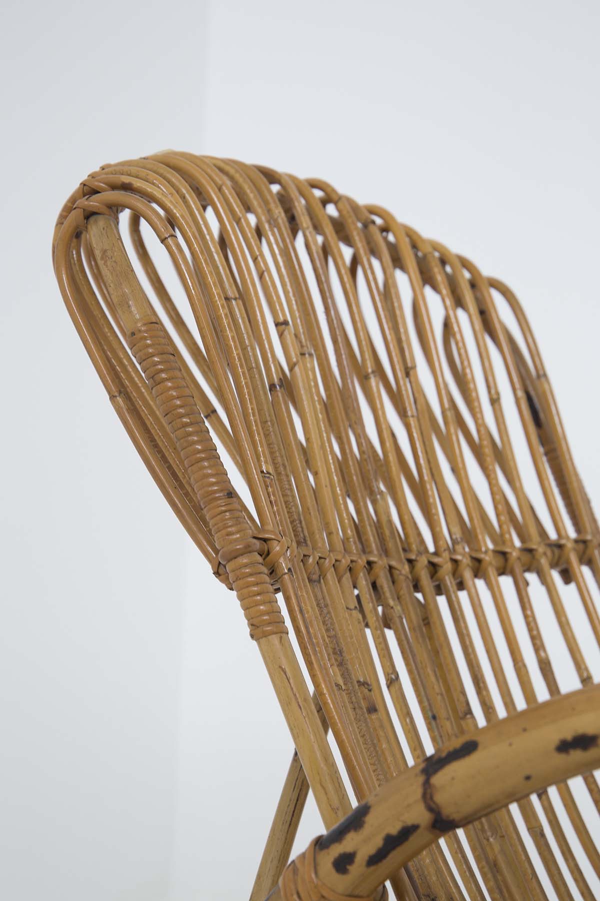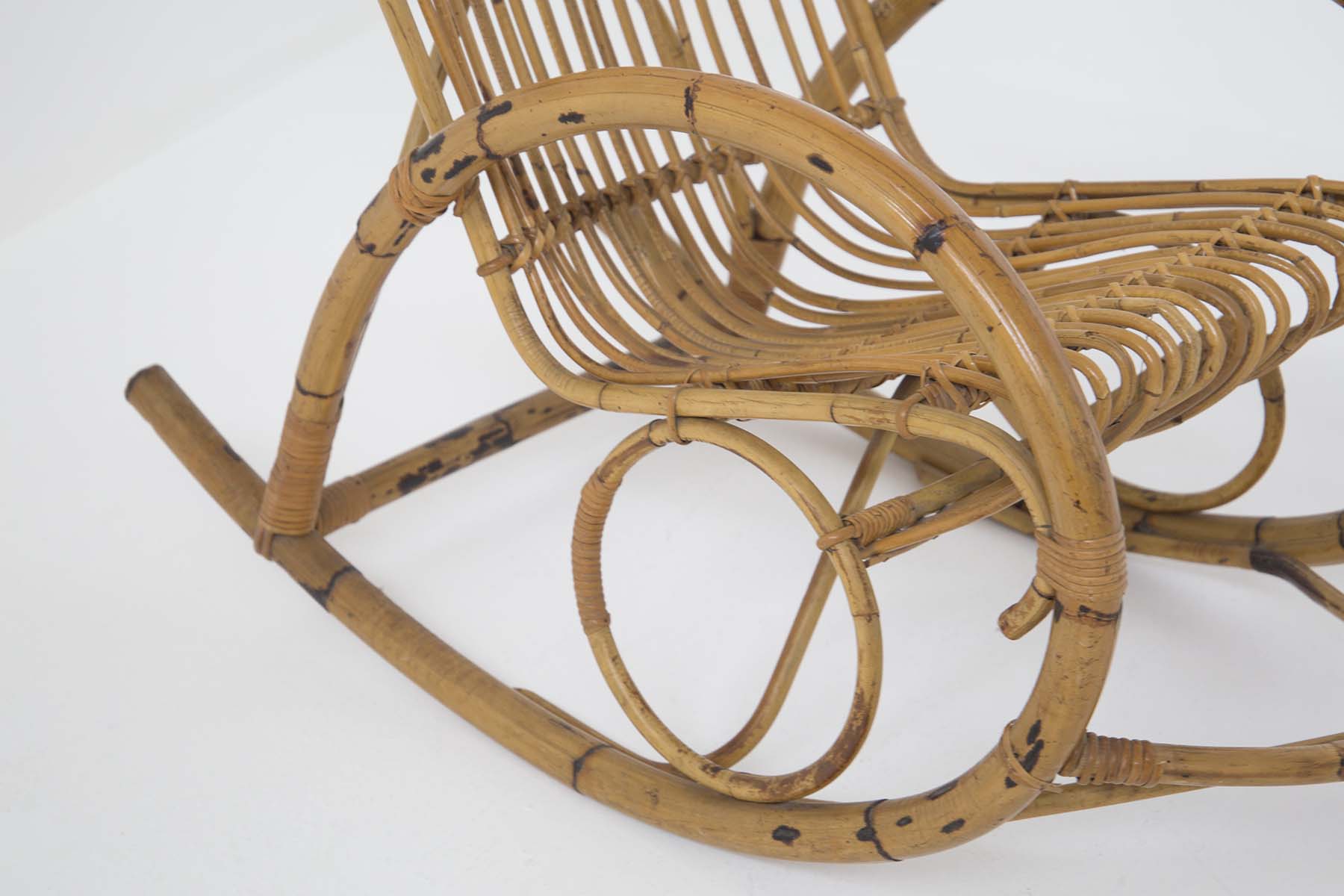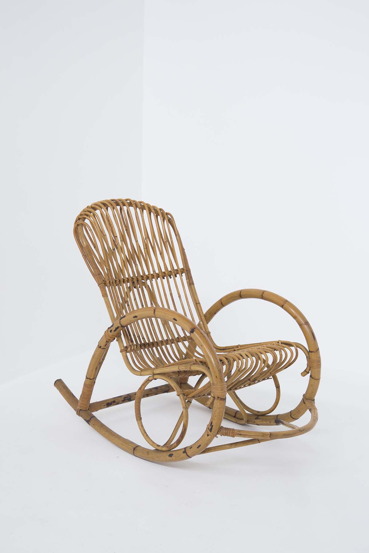 Sedia a dondolo in rattan. Manifattura italiana. Anni '50. Mis. Lung. cm. 58 Alt. cm. 93 Prof. cm. 110 ca.