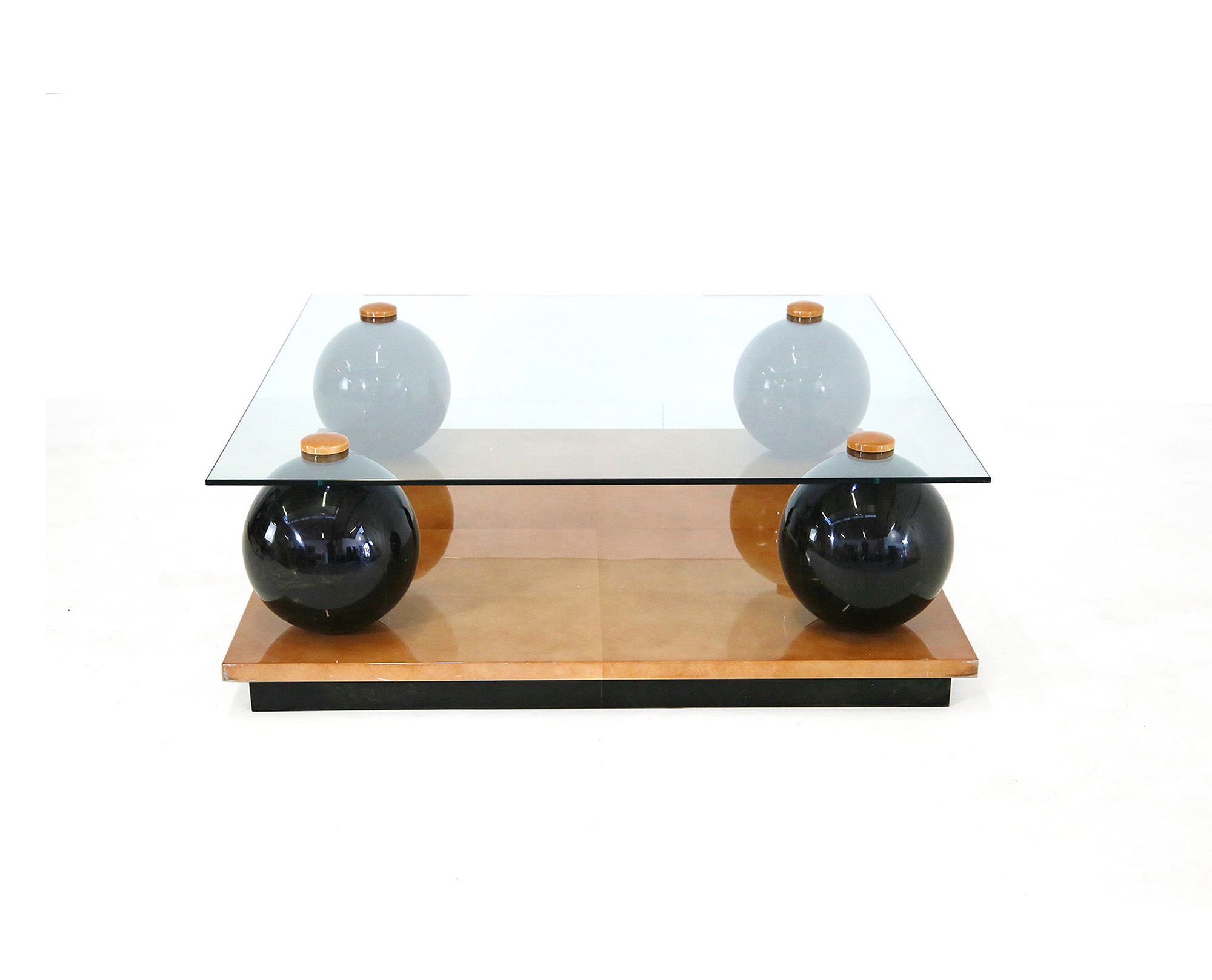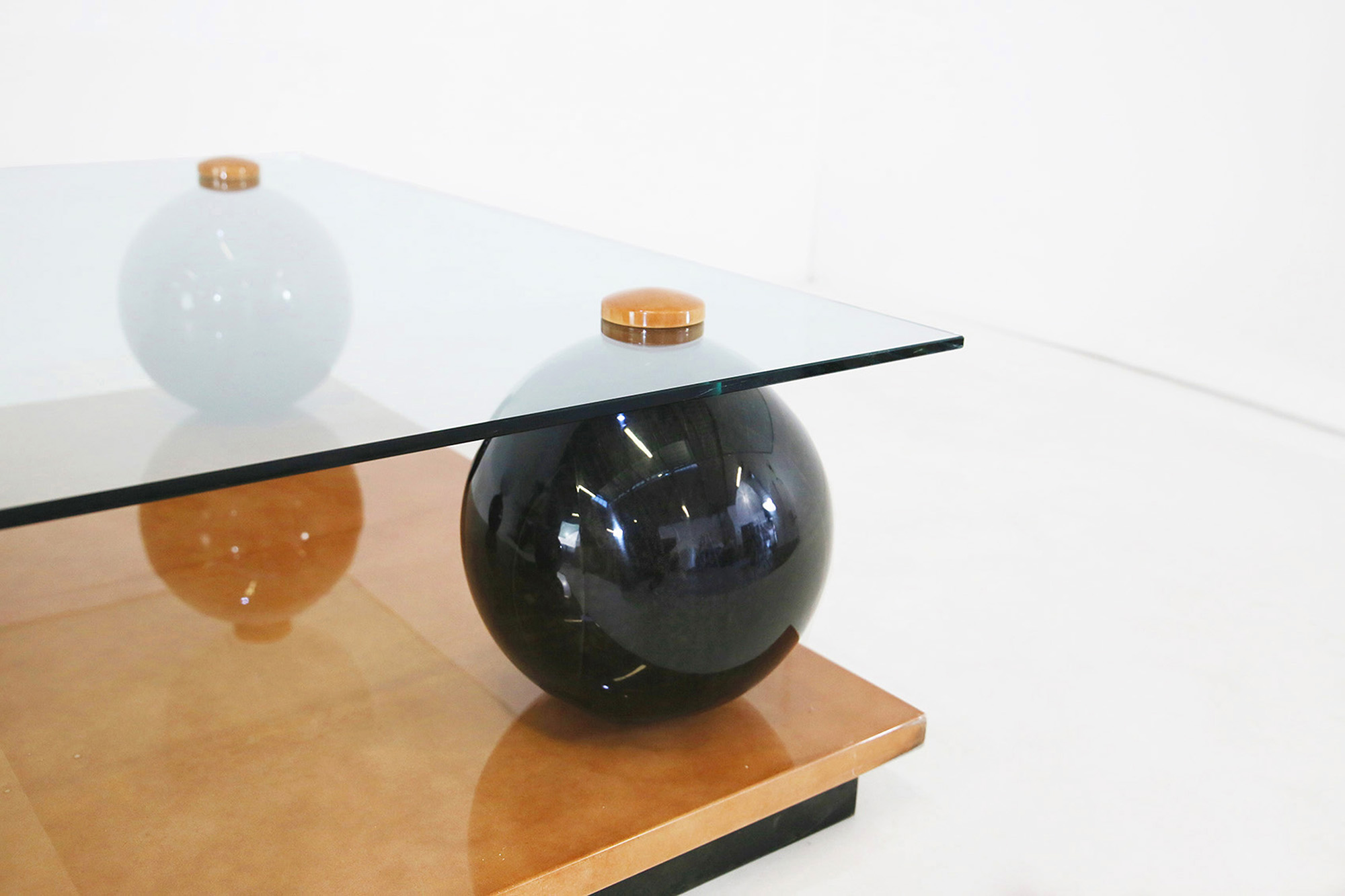 GIORGIO TURA. Tavolo da caffè in pergamena e vetro. Anni '80. Piccoli graffi. Mis. Lung. cm. 65 Alt. cm. 232 Prof. cm. 37 ca.