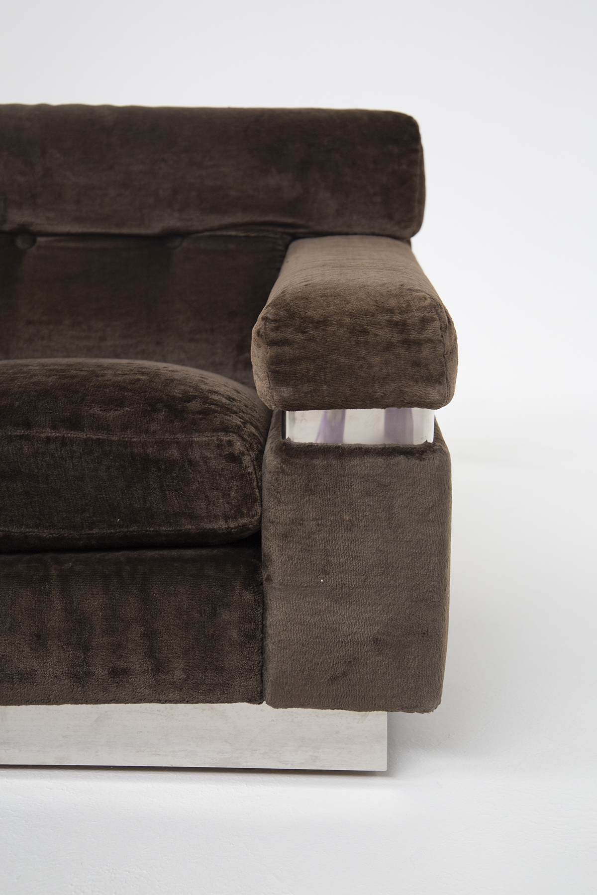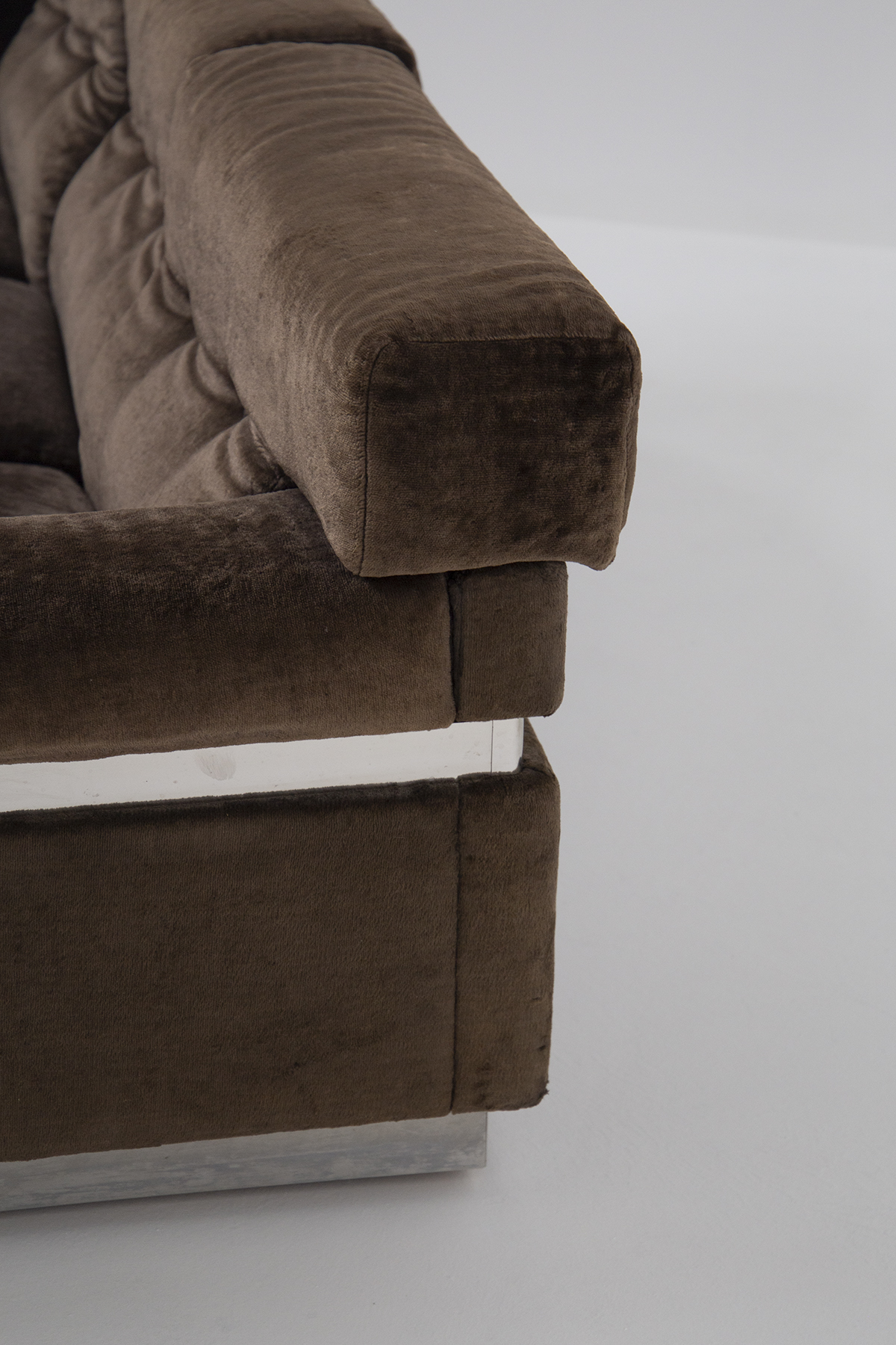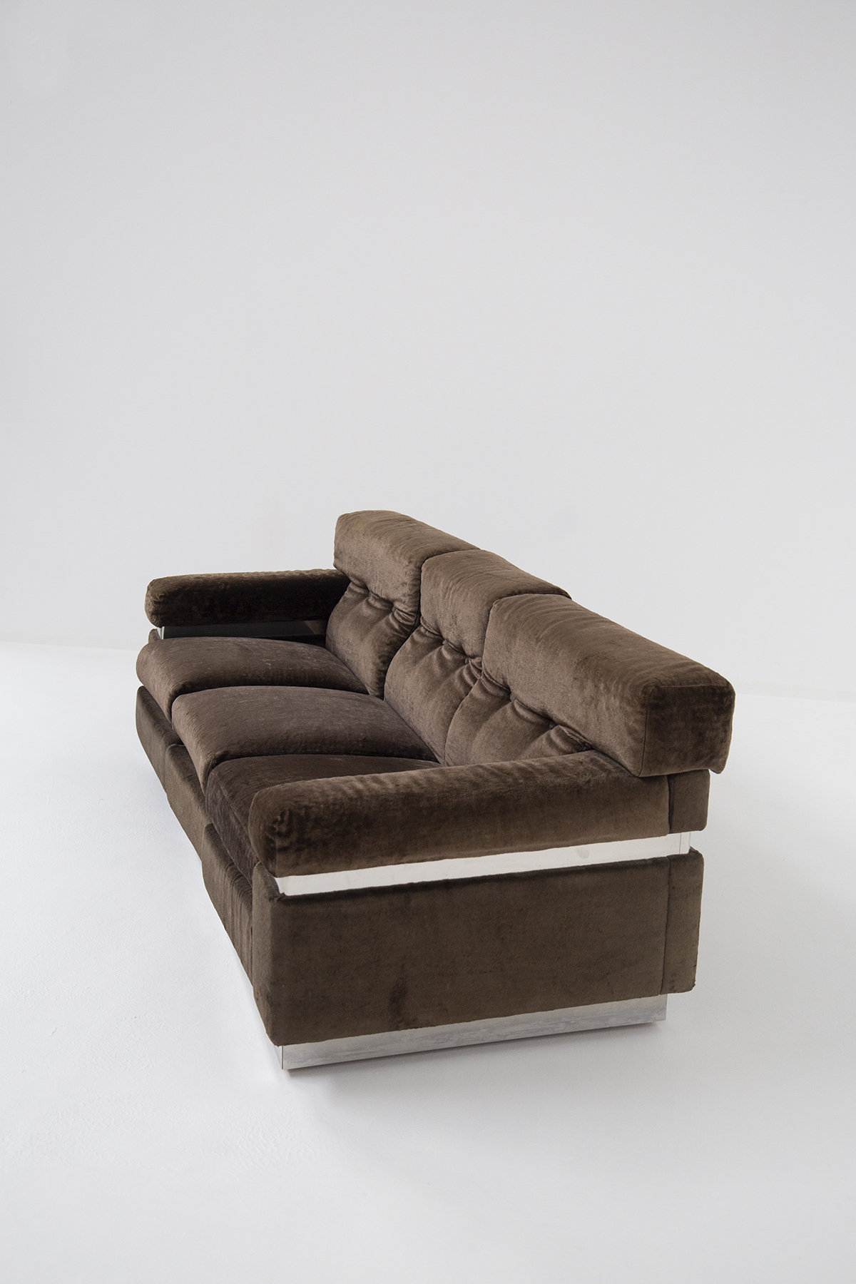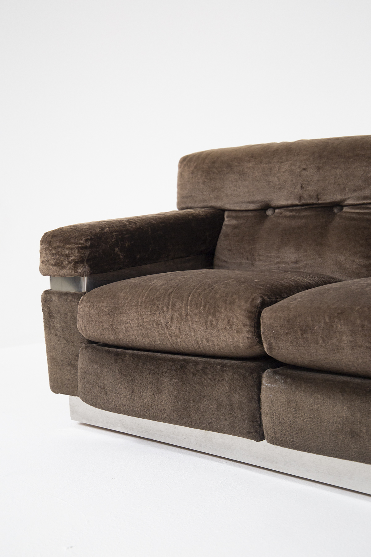 VITTORIO INTROINI (1935). Divano in velluto marrone con inserti in ferro cromato. Anni '70. Mis. Lung. cm. 205 Alt. cm. 70 Prof. cm. 90 ca.