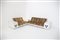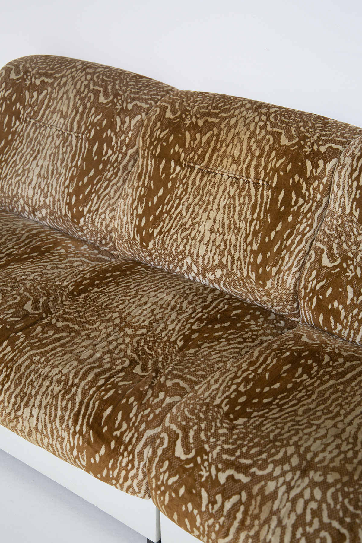 Divano space age composo da due moduli, uno tre posti e due posti l'altro, in legno e tessuto originale completato da tre casse, una centrale e due laterali, per amplificatori. Manifattura italiana. Anni '70. Mis. divani tre posti: Lung. cm. 168, Alt. cm. 67, Prof. cm. 90 ca. Mis. divano due posti: Lung. cm. 112, Alt. cm. 67, Prof. cm 90 ca. Mis. mobile con casse stereo Lung. cm. 40, Alt. cm. 50, Prof. cm. 90 ca. Mis. mobile centrale: Lung. cm. 90, Alt. cm. 47, Prof. cm. 90 ca.