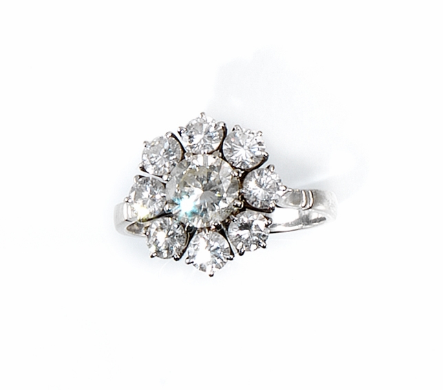 realizzato come una margherita, il pistillo formato da un brillante di ct 1 circa, la corolla da otto brillanti per complessivi ct 1 circa