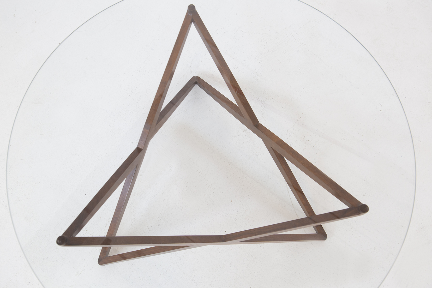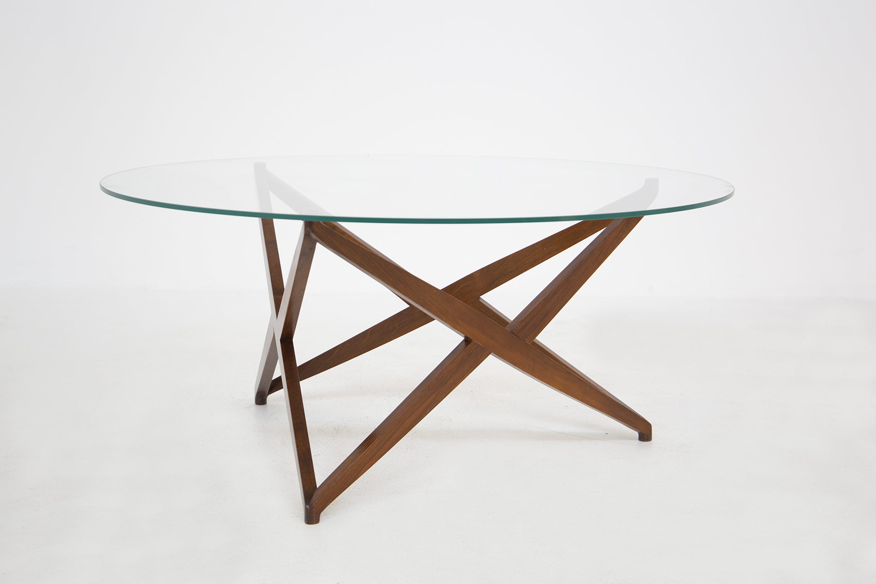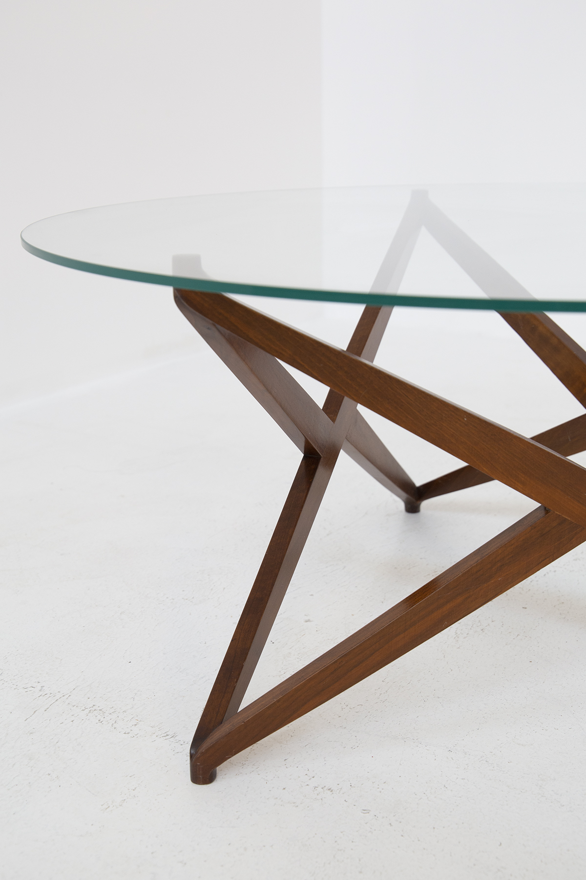 ANGELO OSTUNI. Raro tavolino in legno con base a forma di stella e piano in vetro. Anni '60. Mis. Alt. cm. 45 Diam. cm. 100 ca.
