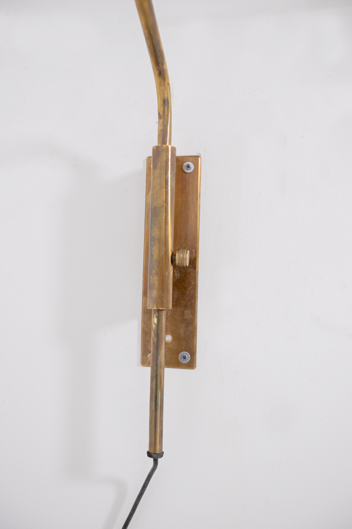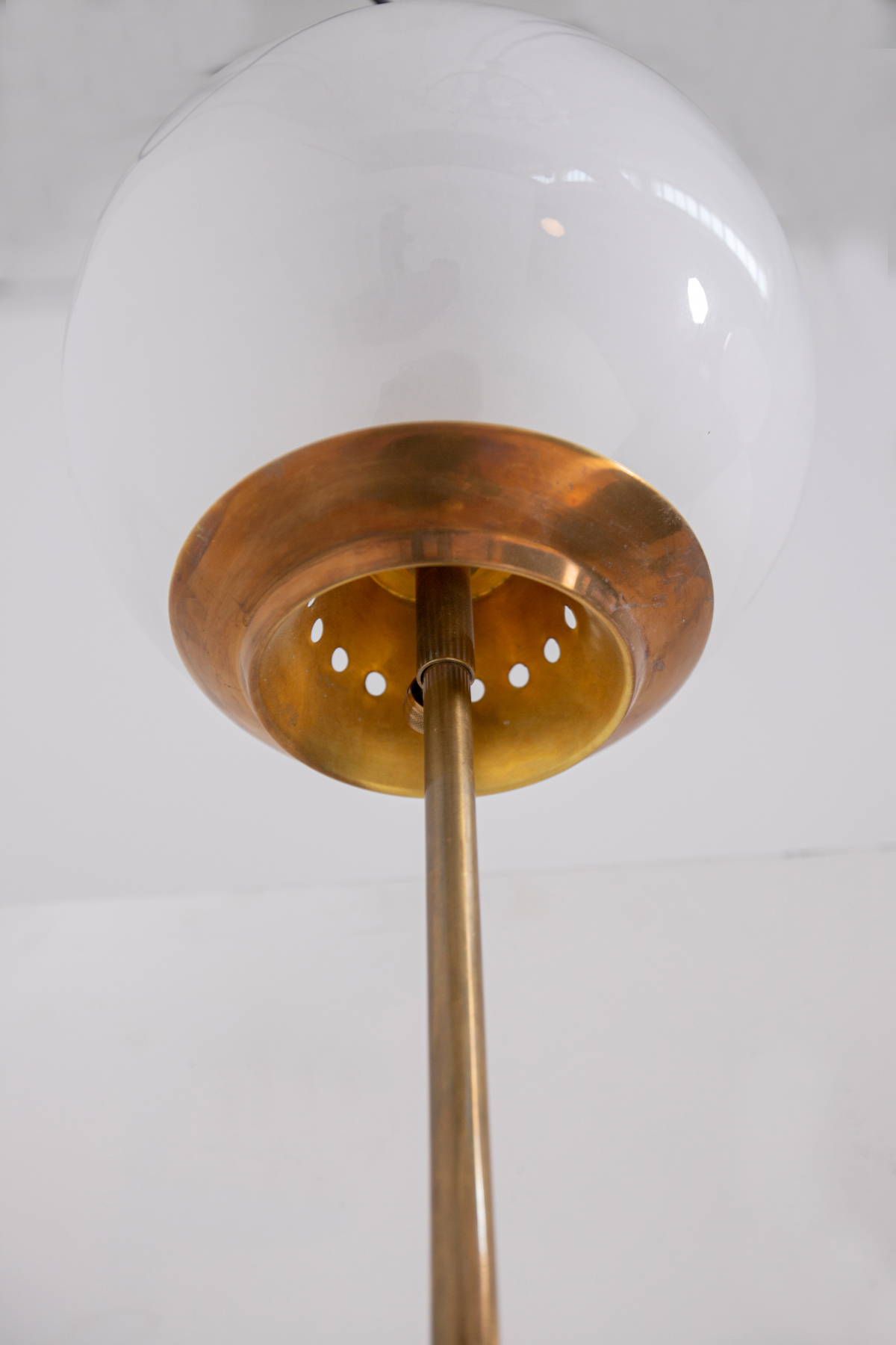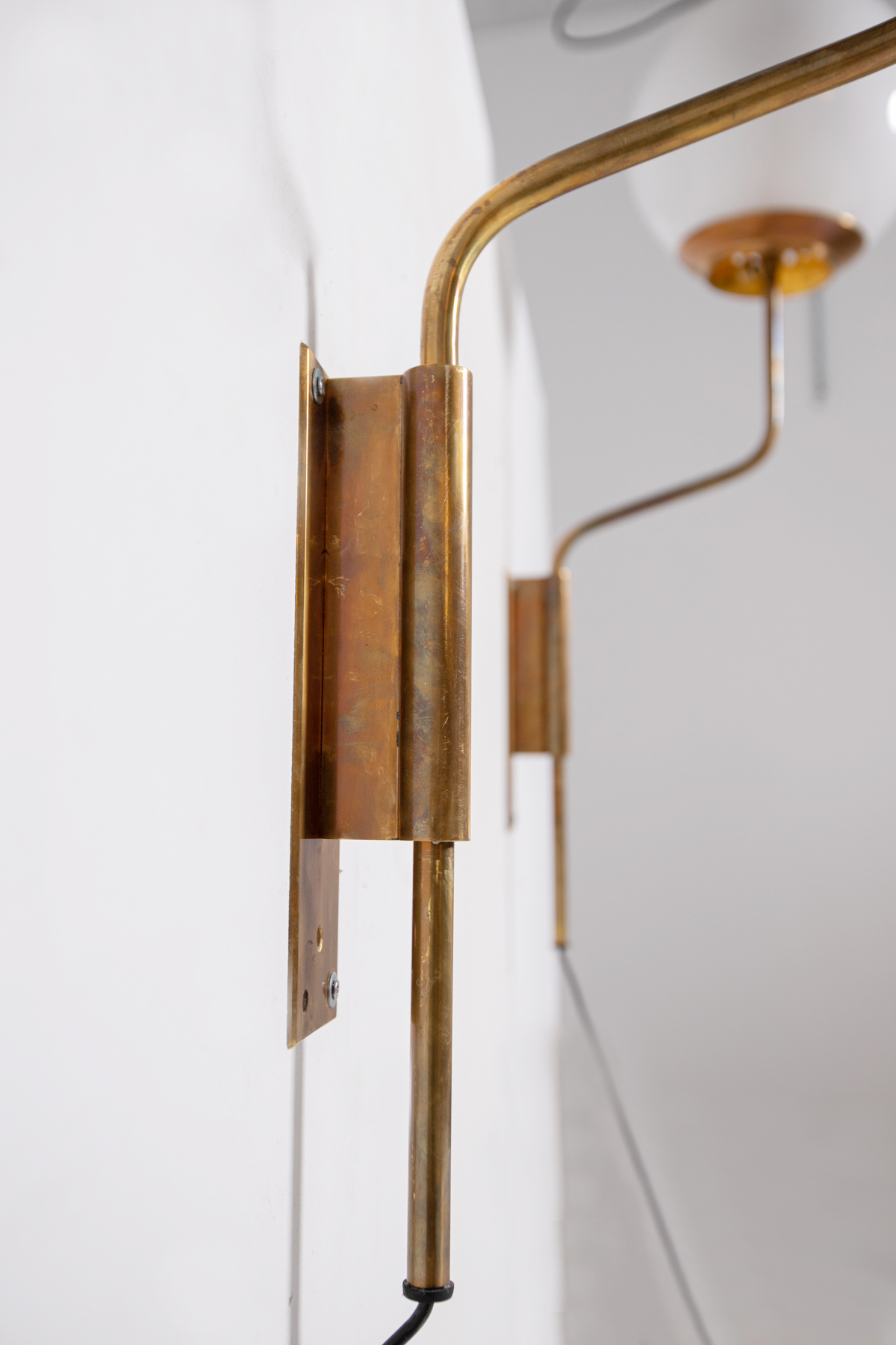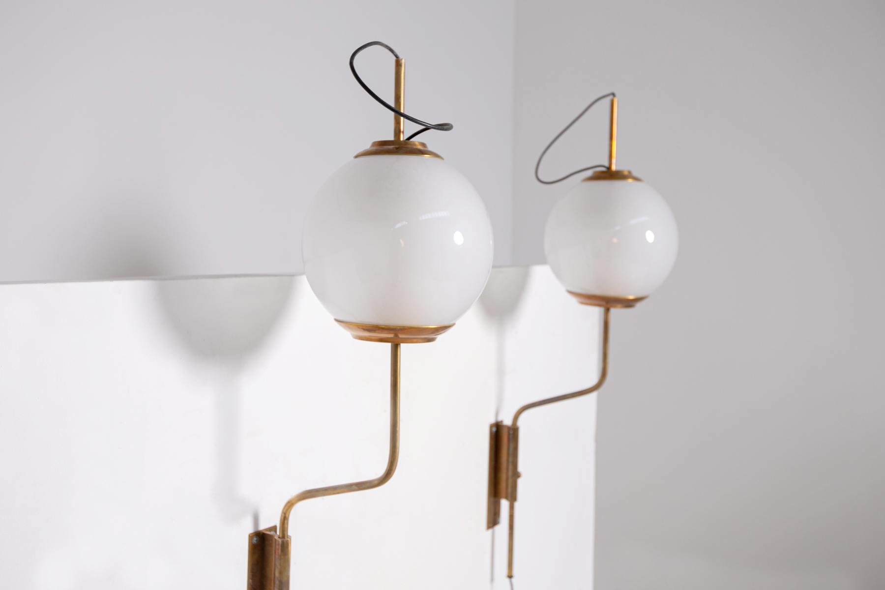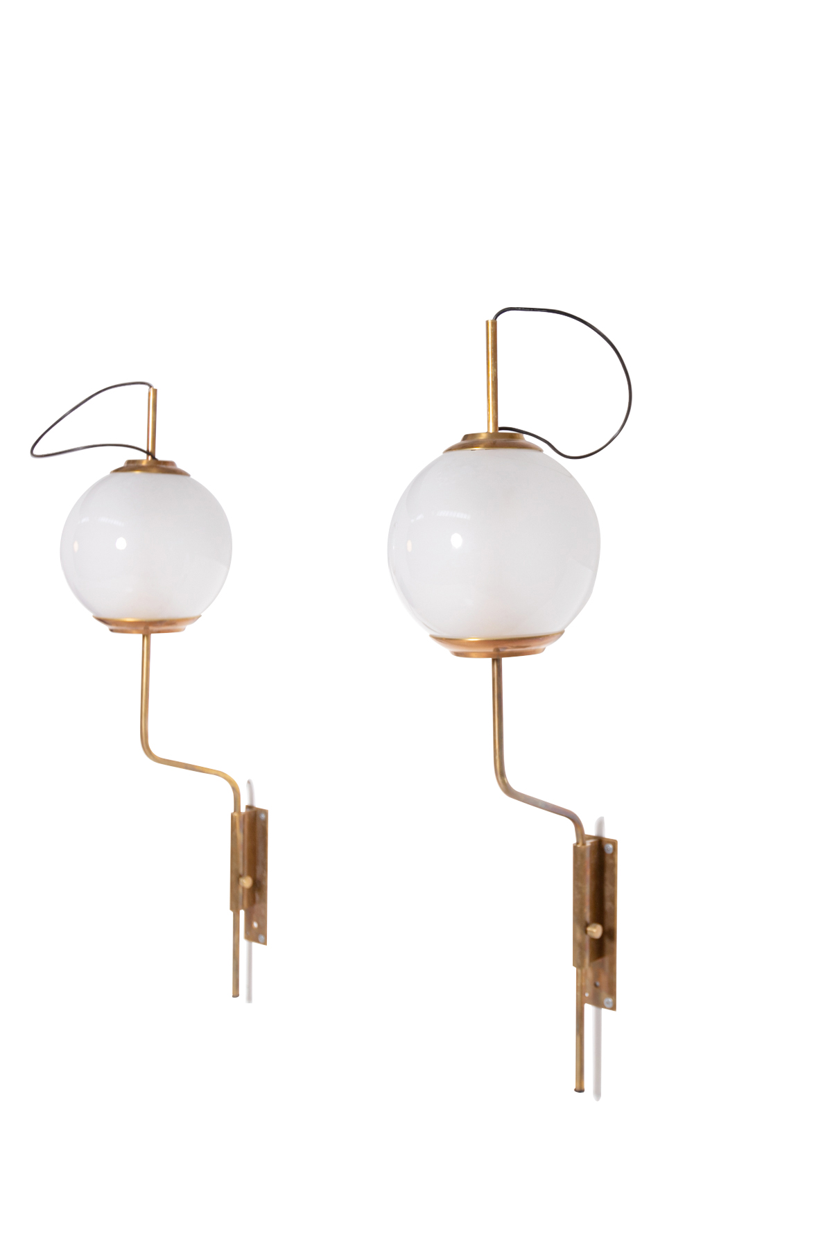 LUIGI CACCIA DOMINIONI (Milano, 1913-2016) per AZUCENA. Coppia di applique modello LP 11 Pallone in ottone e vetro. Anni '50. Mis. Lung. cm. 30 Alt. cm. 115 Prof. cm. 42 ca.