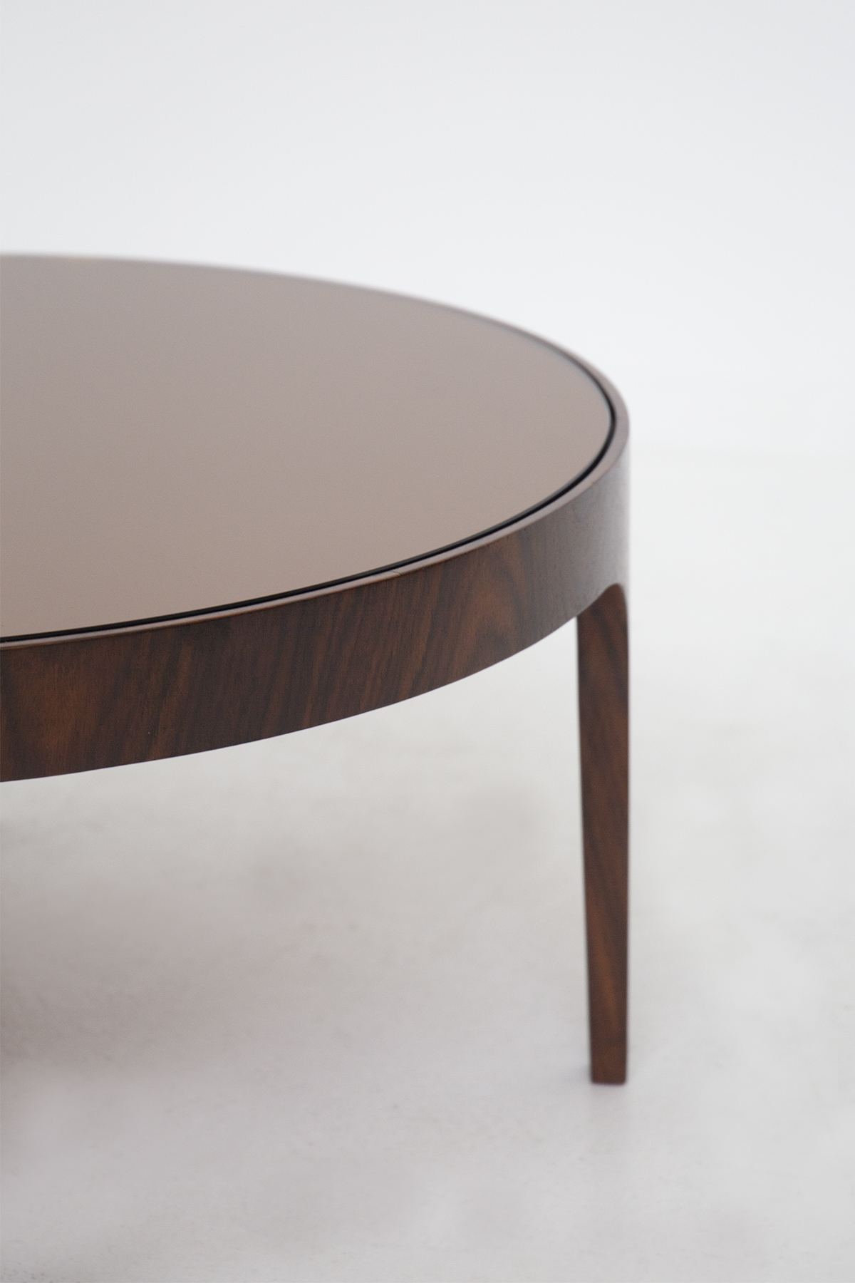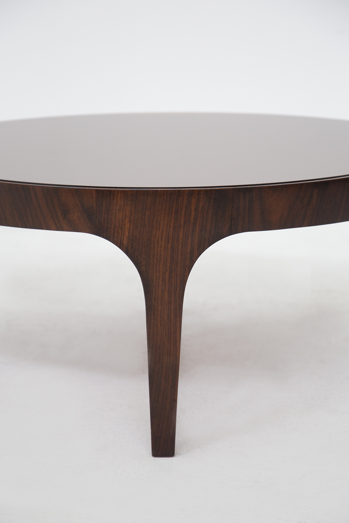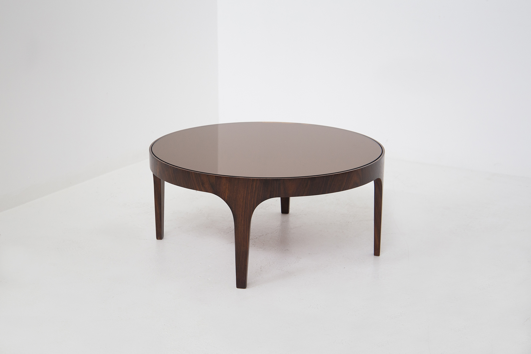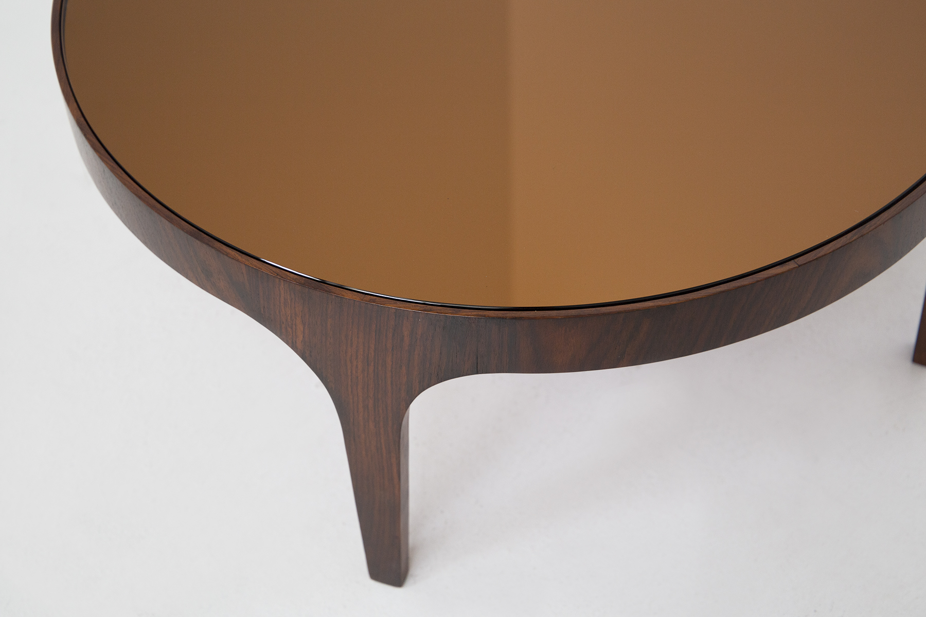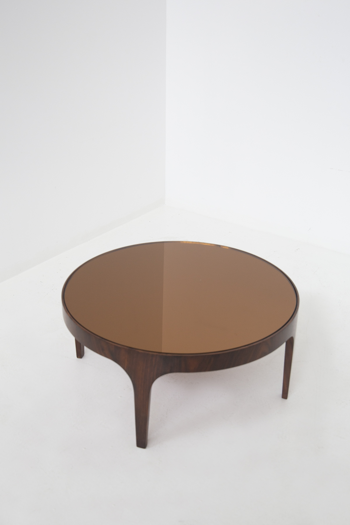 Tavolino in legno e vetro specchiato. Produzione FONTANA ARTE. Anni '50. Pubblicato su Vitrium. Ottime condizioni. Mis. Alt. cm. 37 Diam. cm. 79.5 ca.