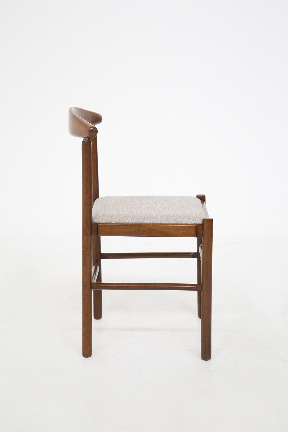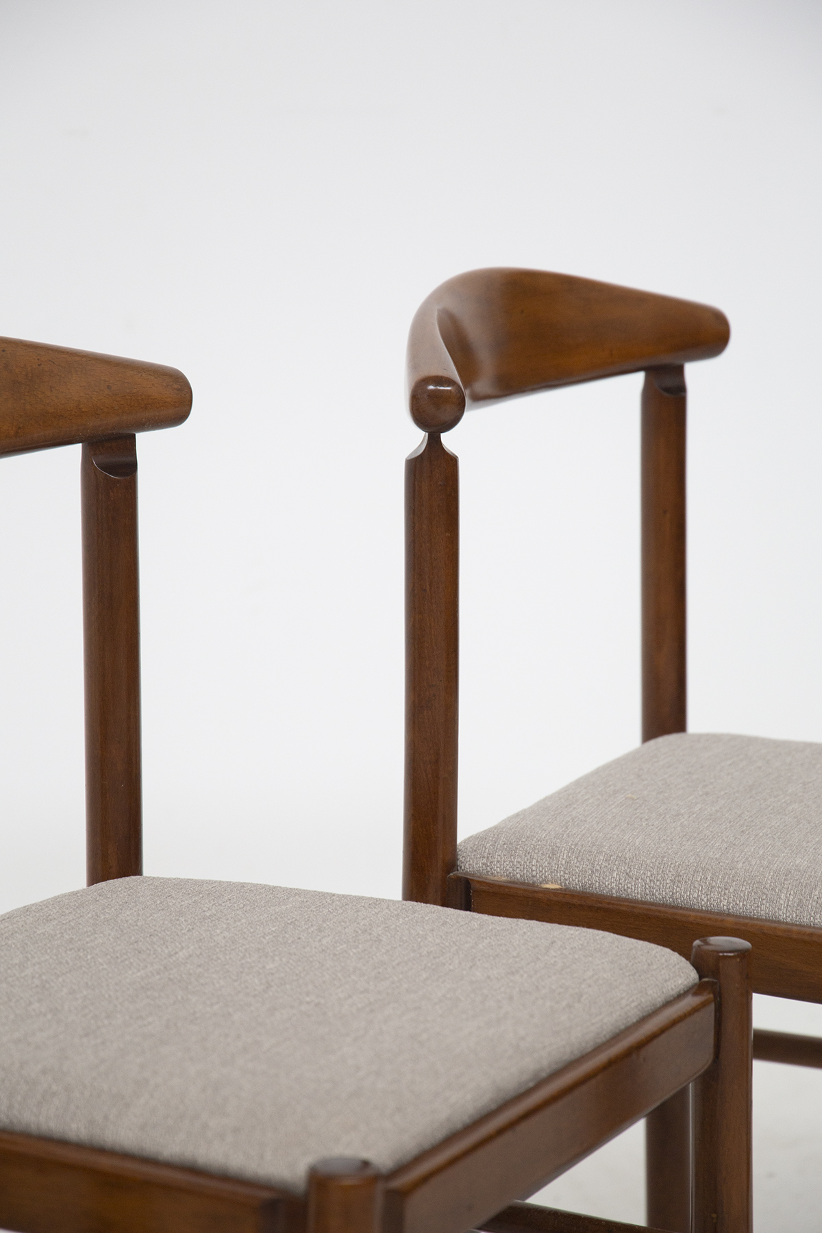 Quattro sedie in legno e tessuto color grigio. Manifattura italiana. Anni '50. Mis. Lung. cm. 43 Alt. cm. 79 Prof. cm. 46 ca.