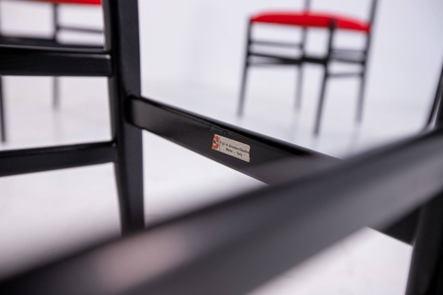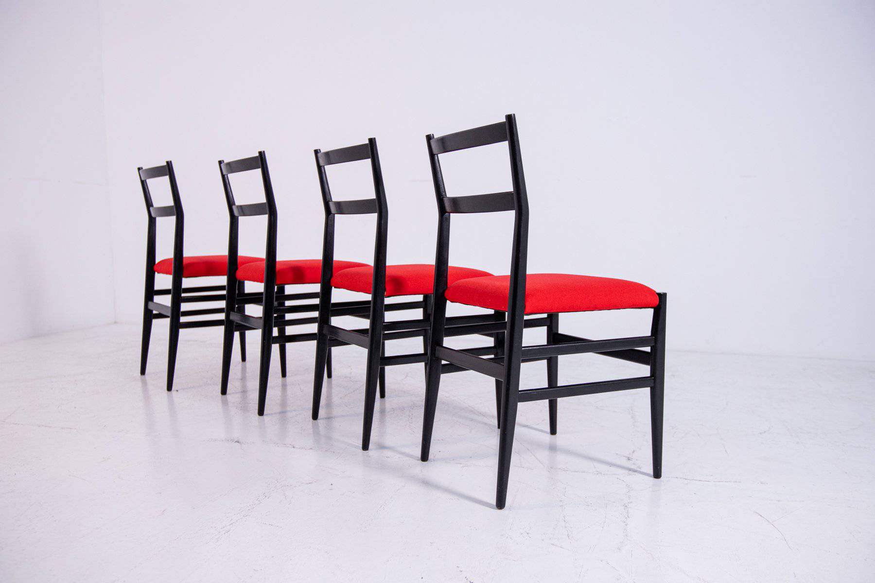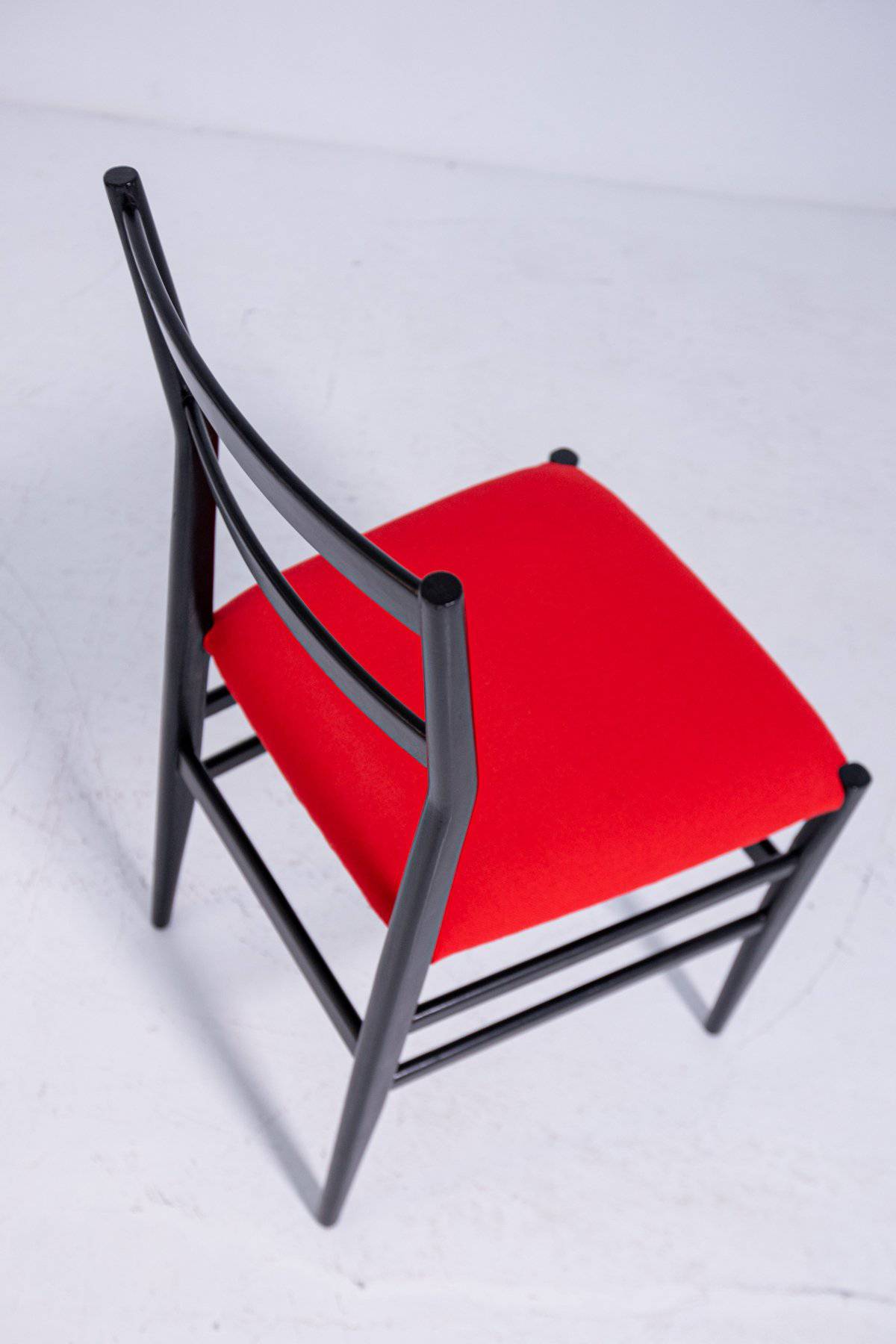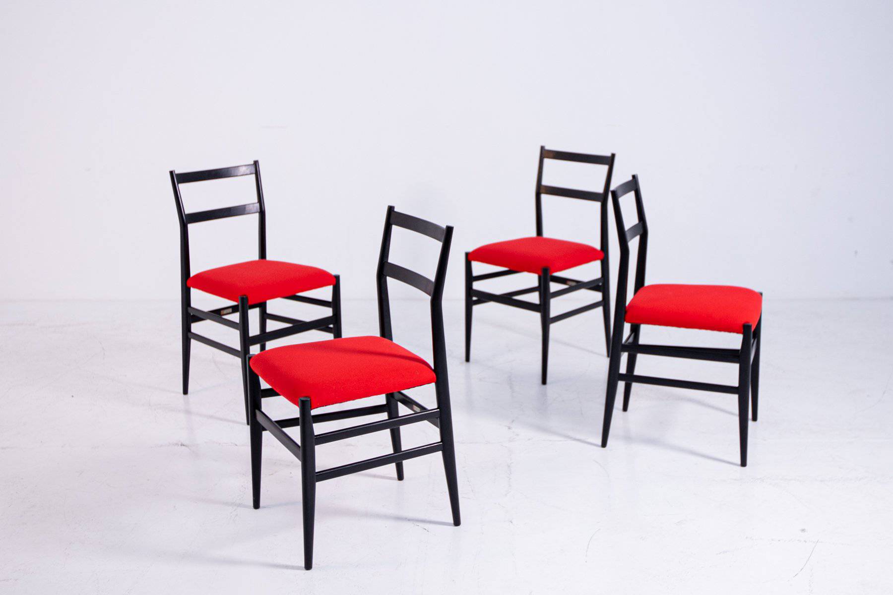 GIO PONTI (Milano, 1891-1979) per CASSINA. Quattro sedie modello Leggera in legno laccato nero con seduta in stoffa rossa. Etichetta del produttore. Anni '50. Segni di usura. Mis. Lung. cm. 42 Alt. cm. 83 Prof. cm. 42 ca.