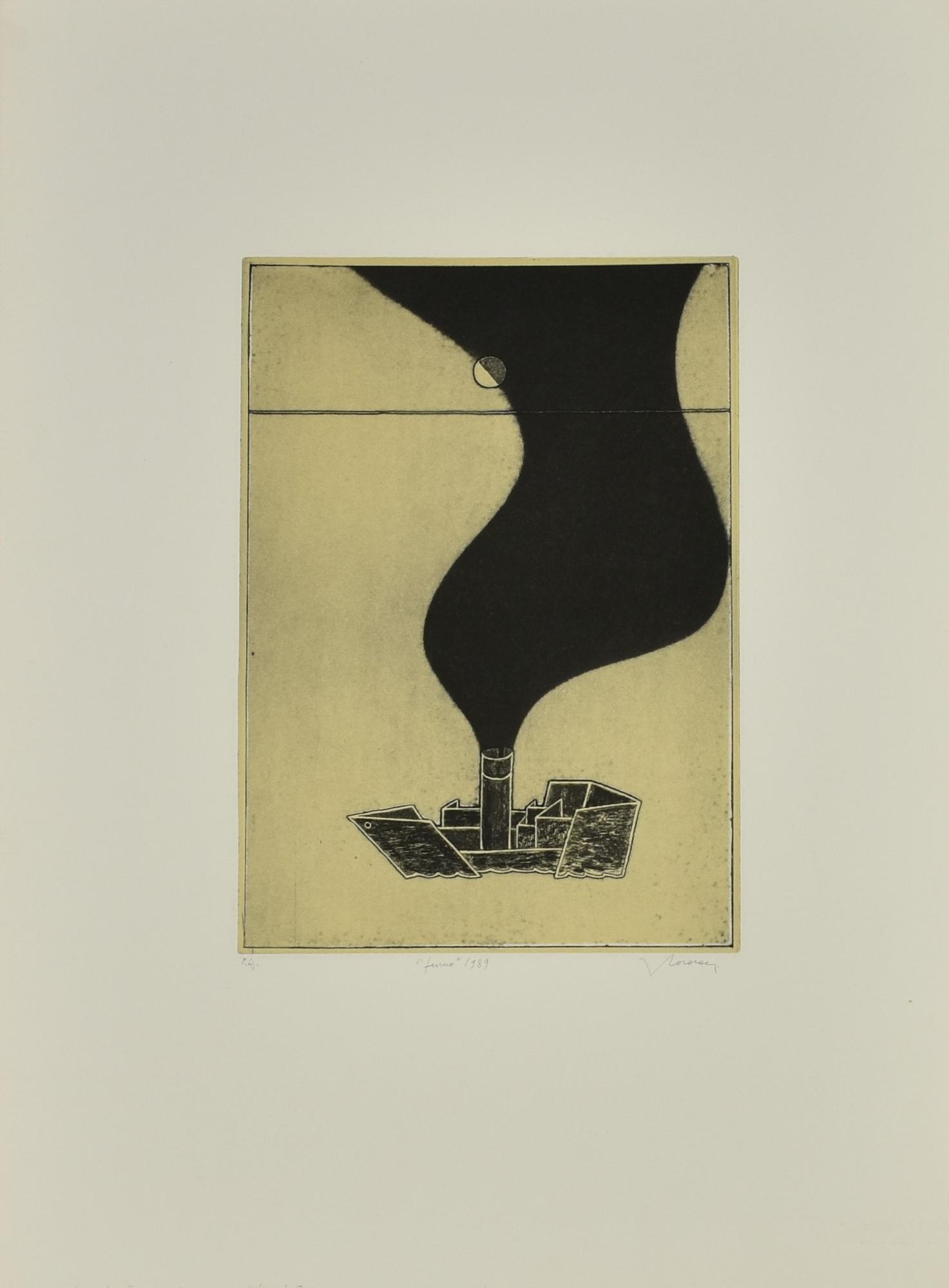 Acquaforte con fondo giallo stampato, mm 358x250, su foglio cm 70x50; es. P.A.