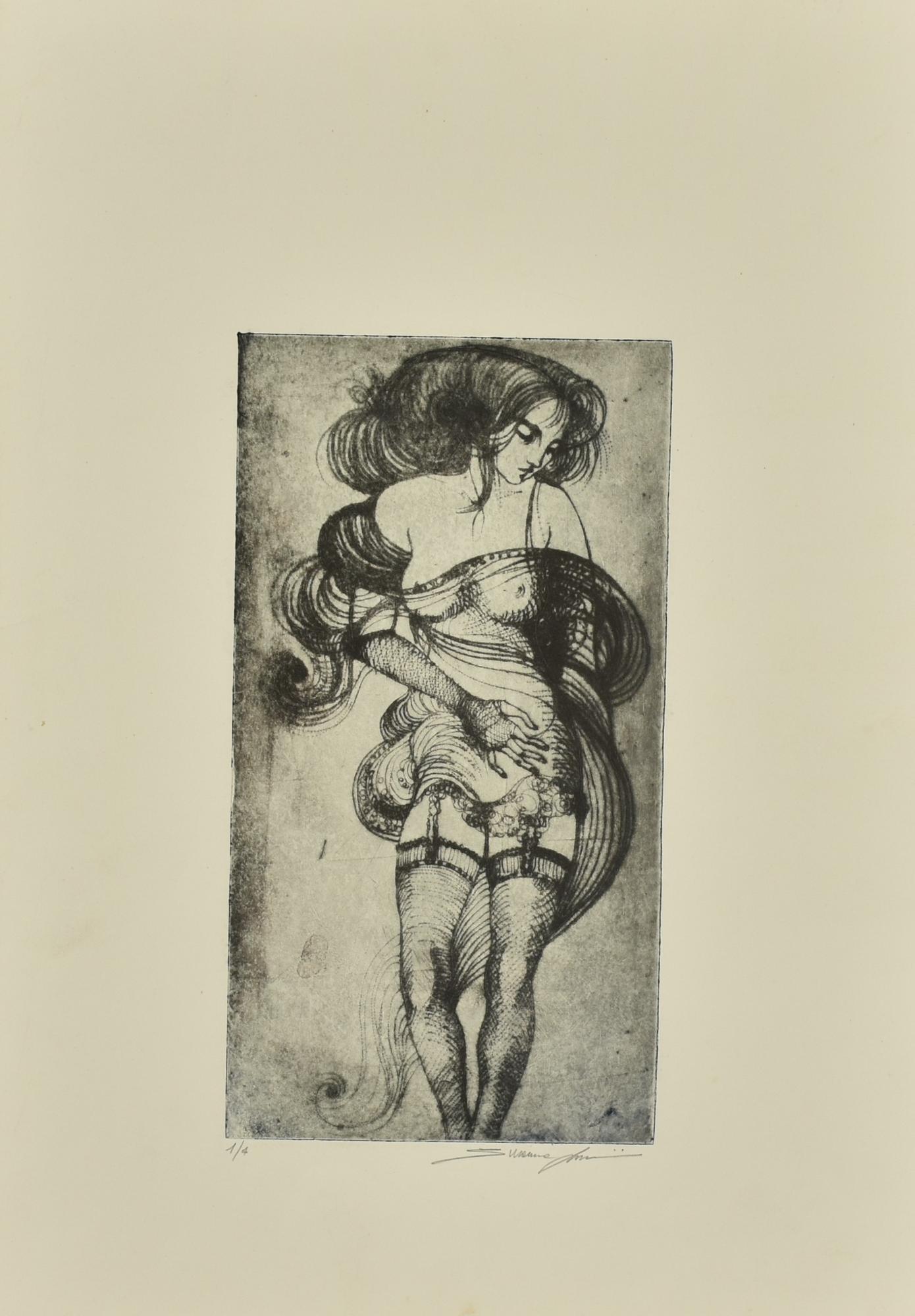 Ignoto FIGURA FEMMINILE acquaforte su carta, cm 29x15,5, su foglio cm 50x35;...