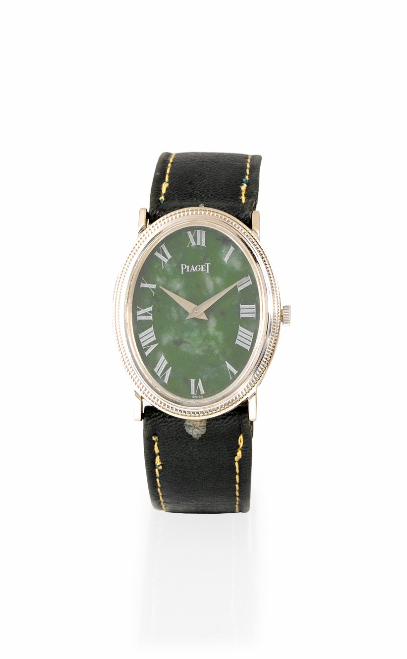 Cassa ovale con fondello a scatto, lunetta guilloche, vetro zaffiro. Quadrante in giada con numeri romani argentati, lancette dauphine. Movimento a carica manuale. Cinturino in pelle verde con fibbia ad ardiglione in oro bianco 18 kt Piaget. Dim. mm 32x25