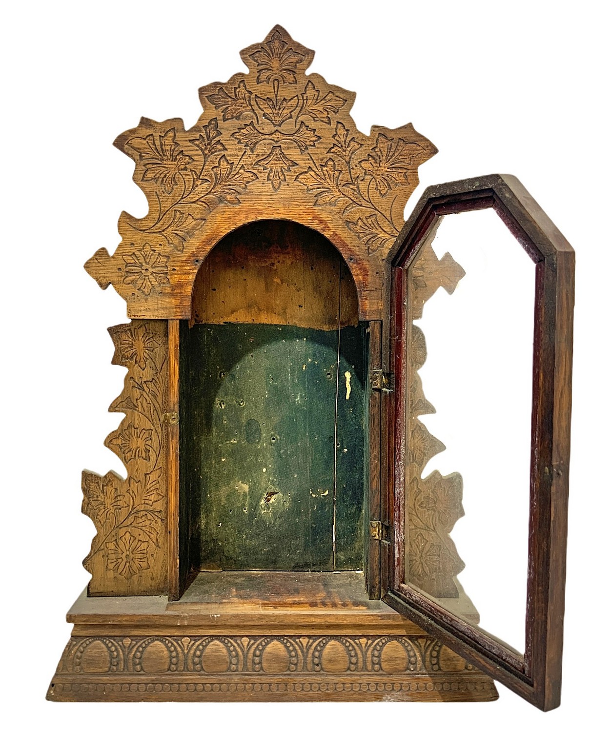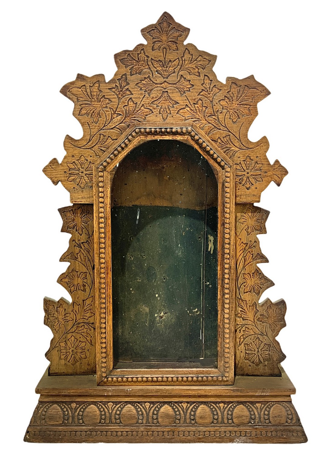 Piccola edicola in legno bulinato a foglia d'oro. XIX secolo.