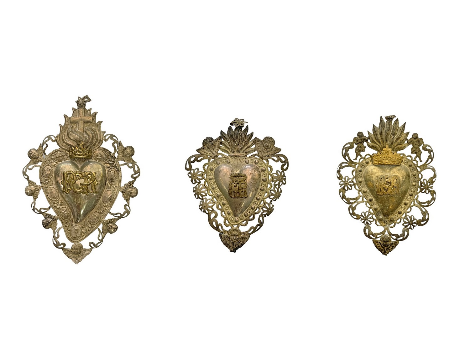 N 3 Ex voto in argento a forma di cuore con puttini e simboli della passione. 1) H cm 23 2) H cm 17 3) H cm 20