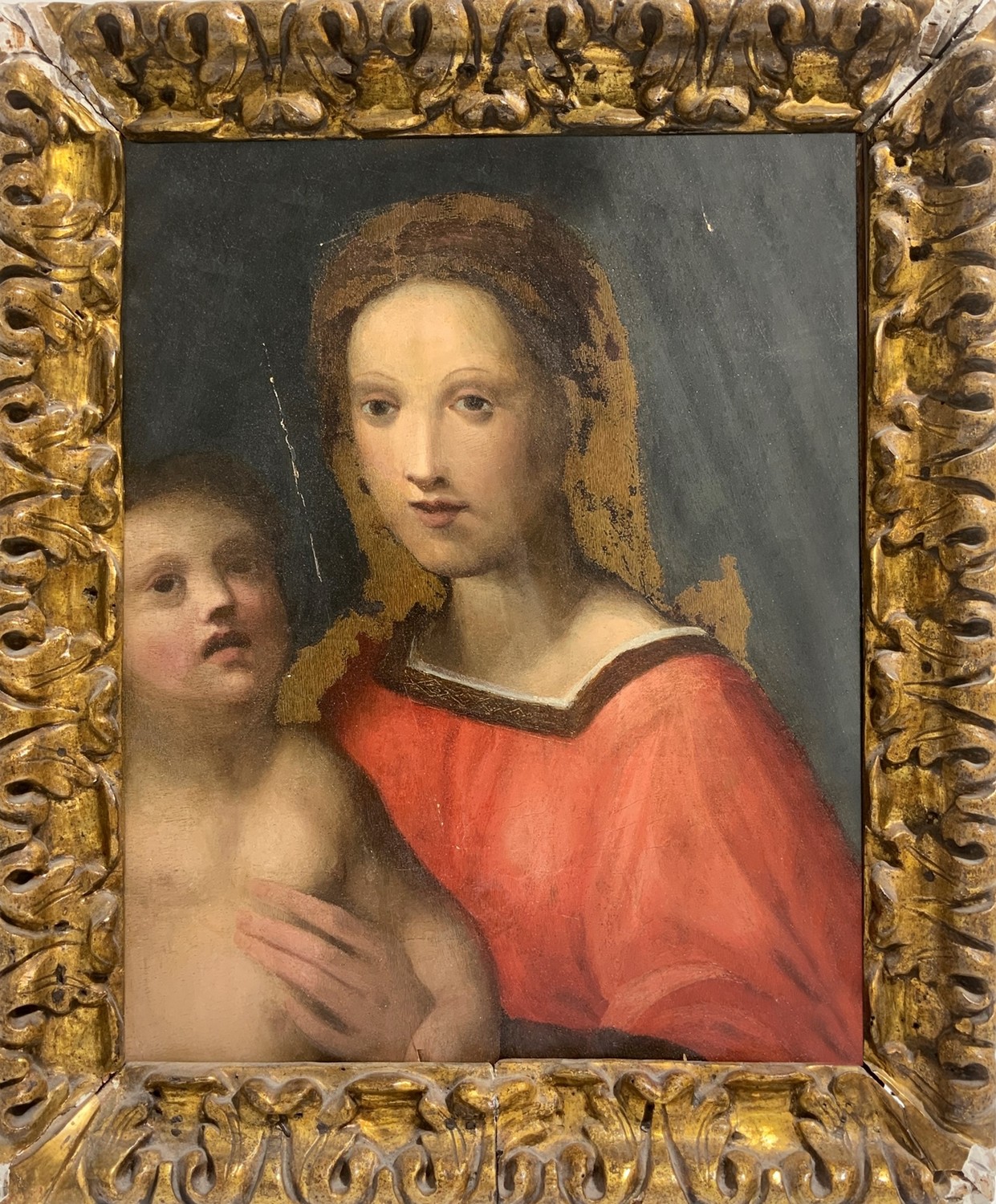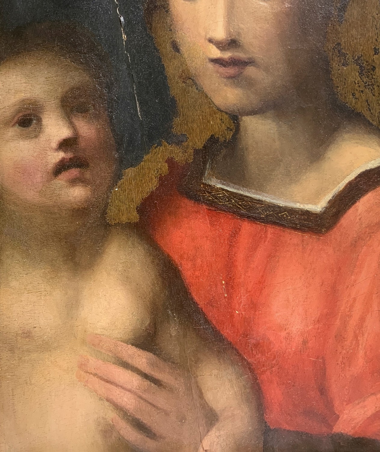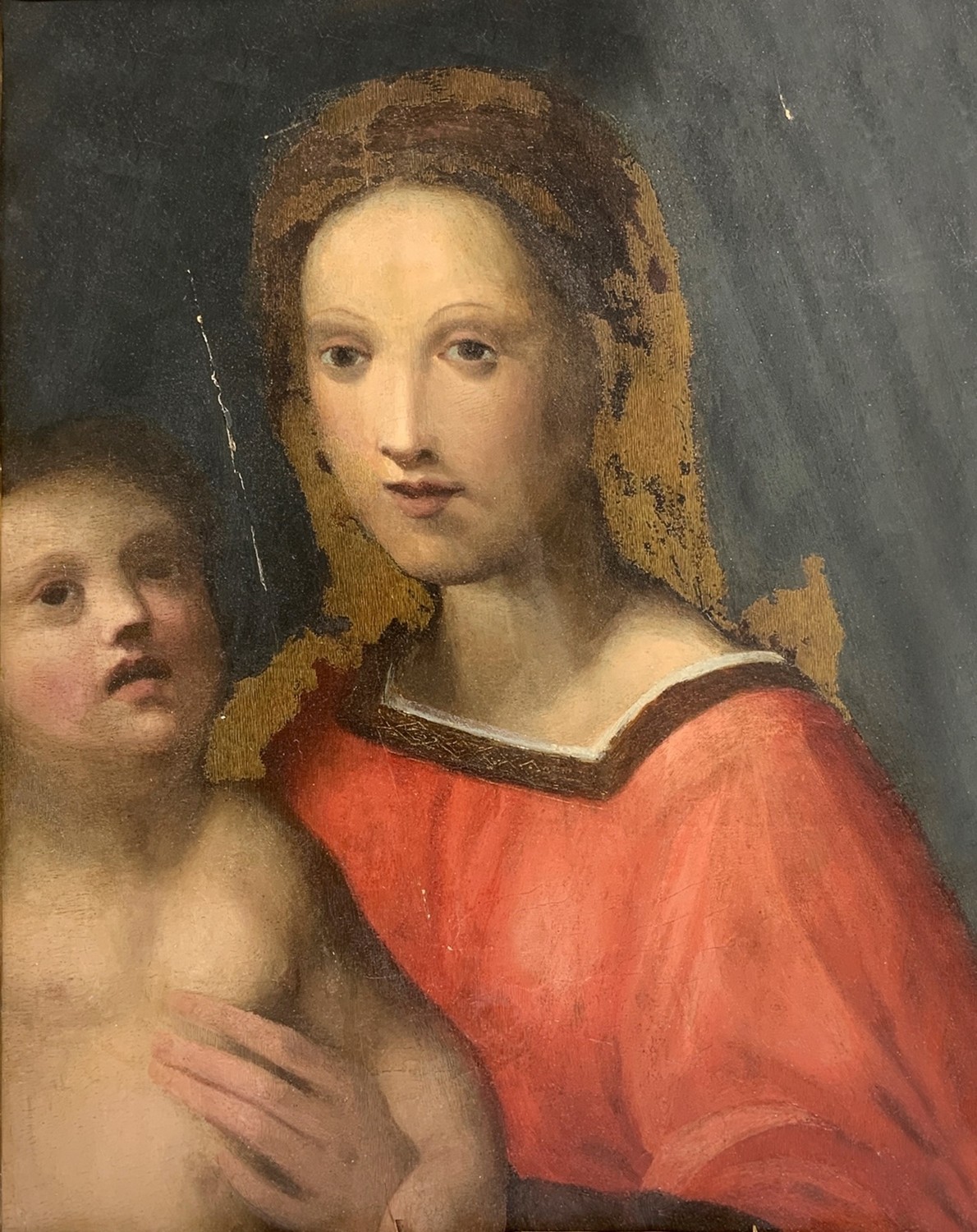 Dipinto ad olio su tavola raffigurante Madonna con bambino.