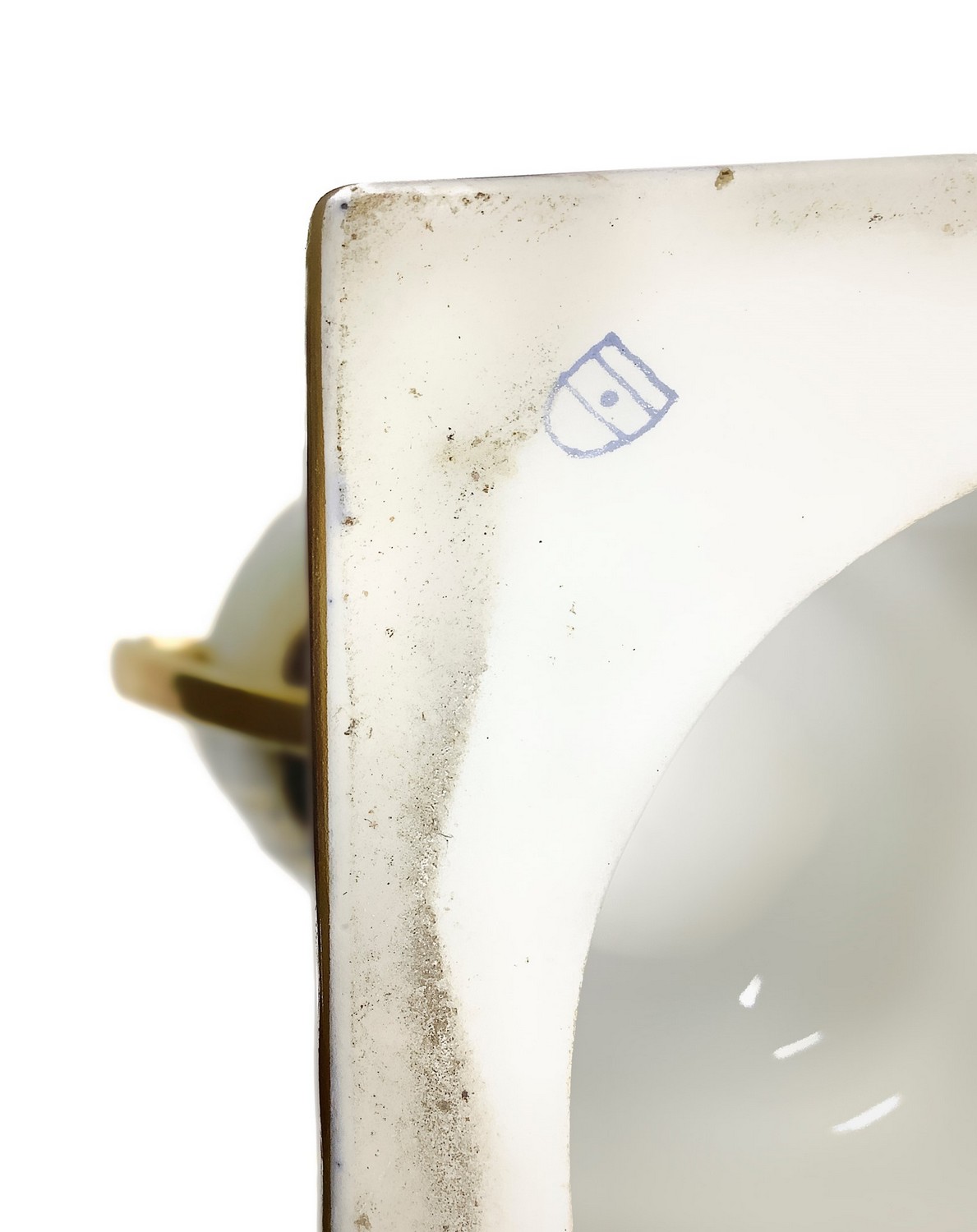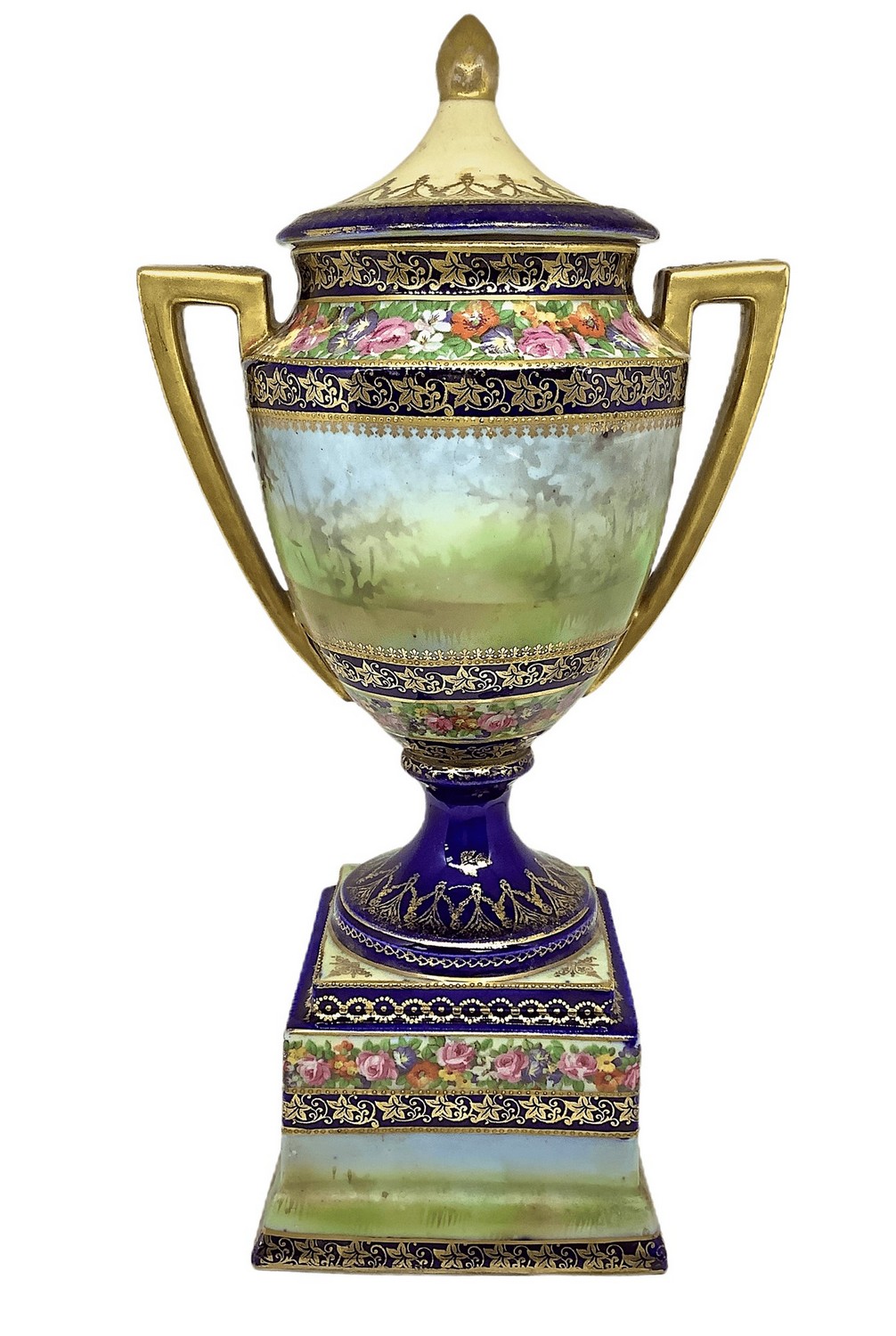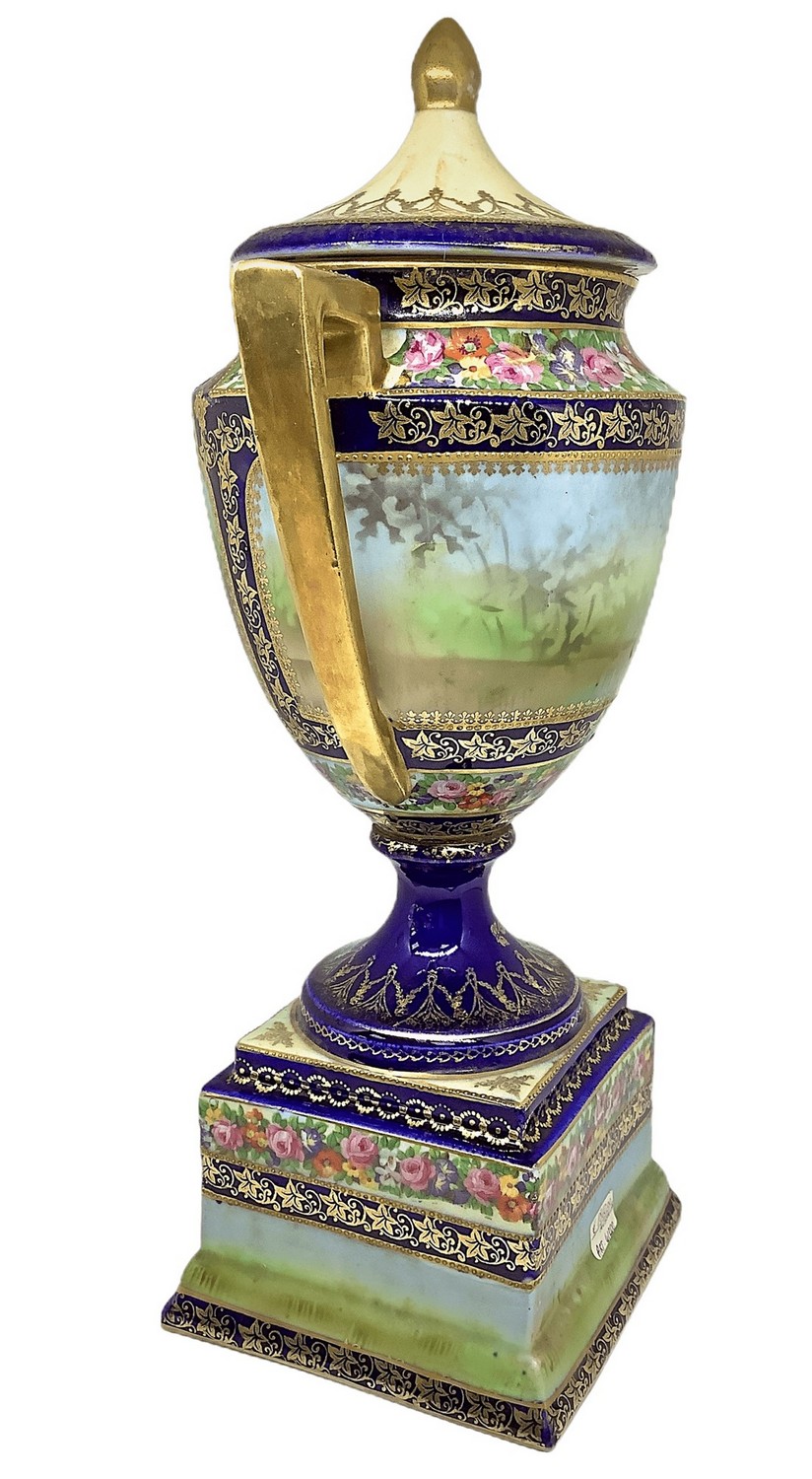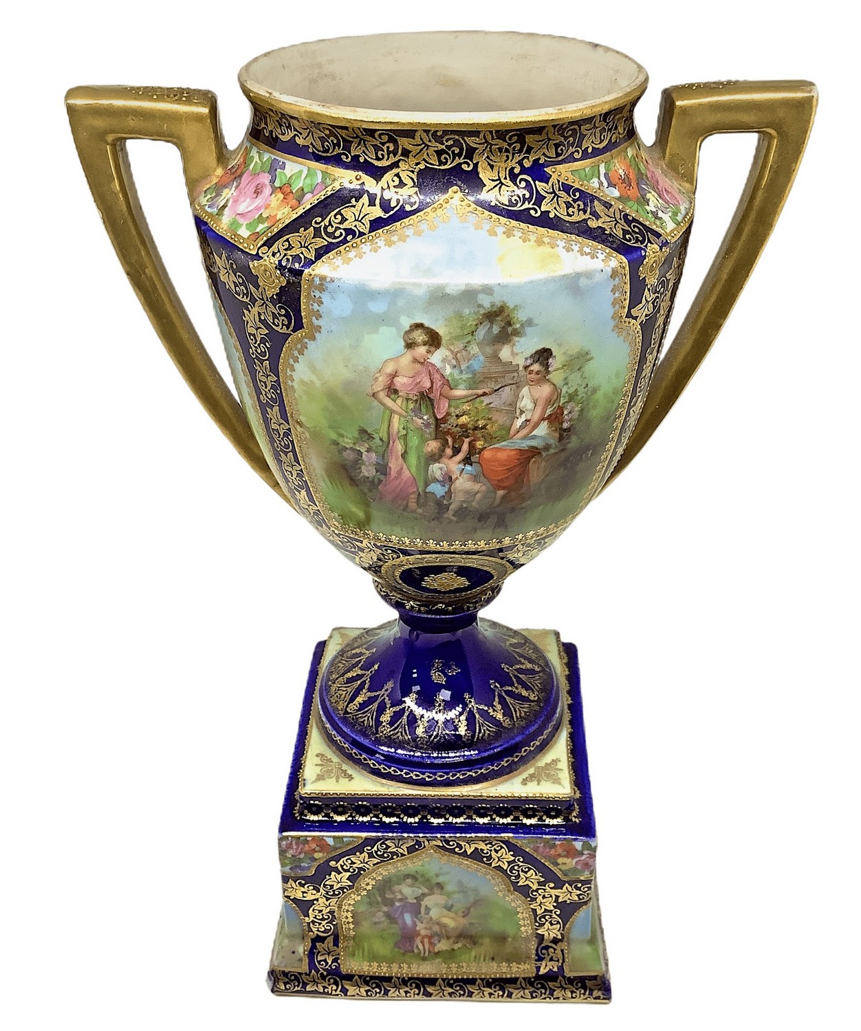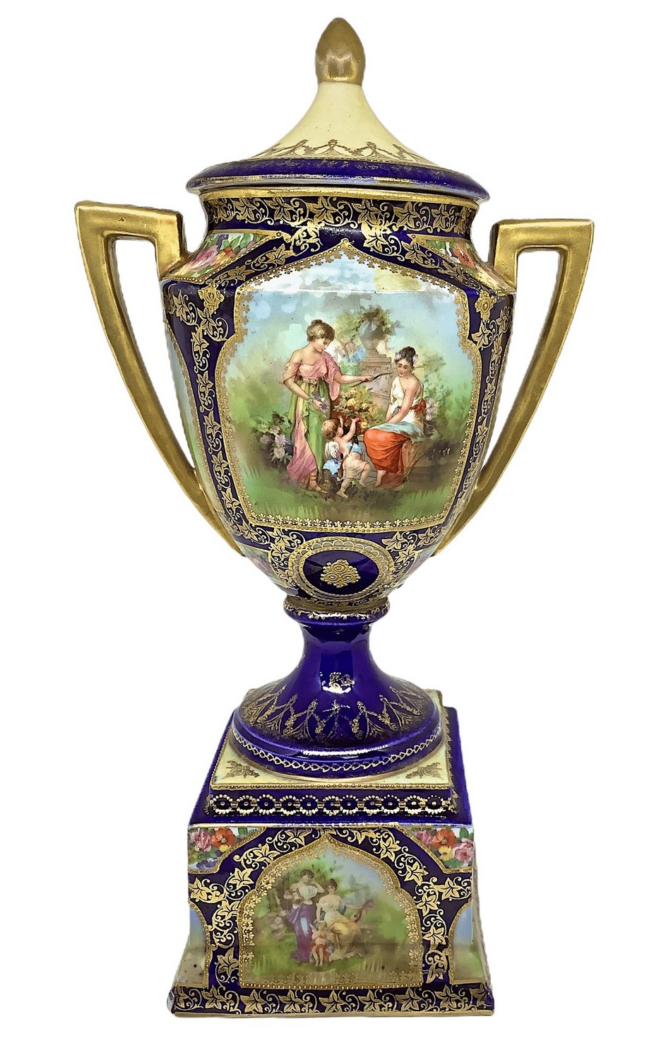 Potiche in porcellana Vienna . con base a plinto e scene di genere entro riserve con bordi in oro. Marchio sottostante alla base. H cm 36 Base cm 12x12 XIX secolo
