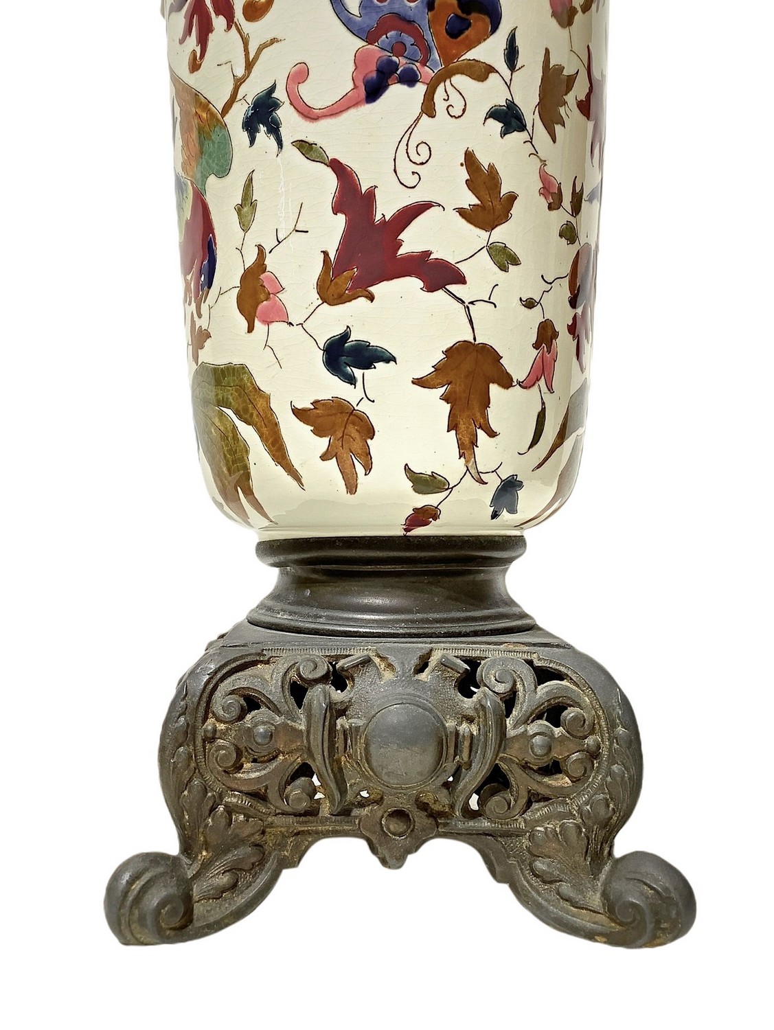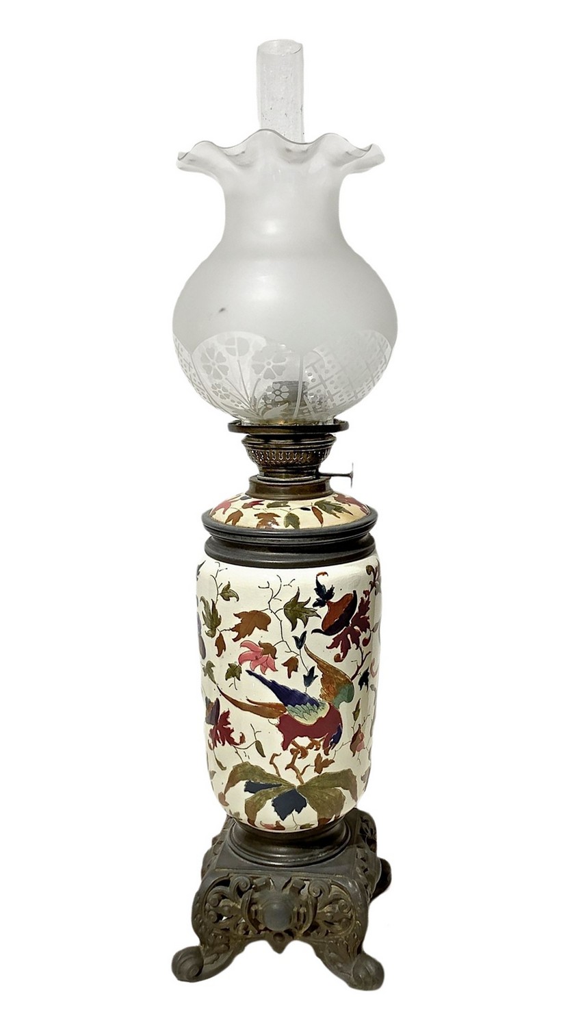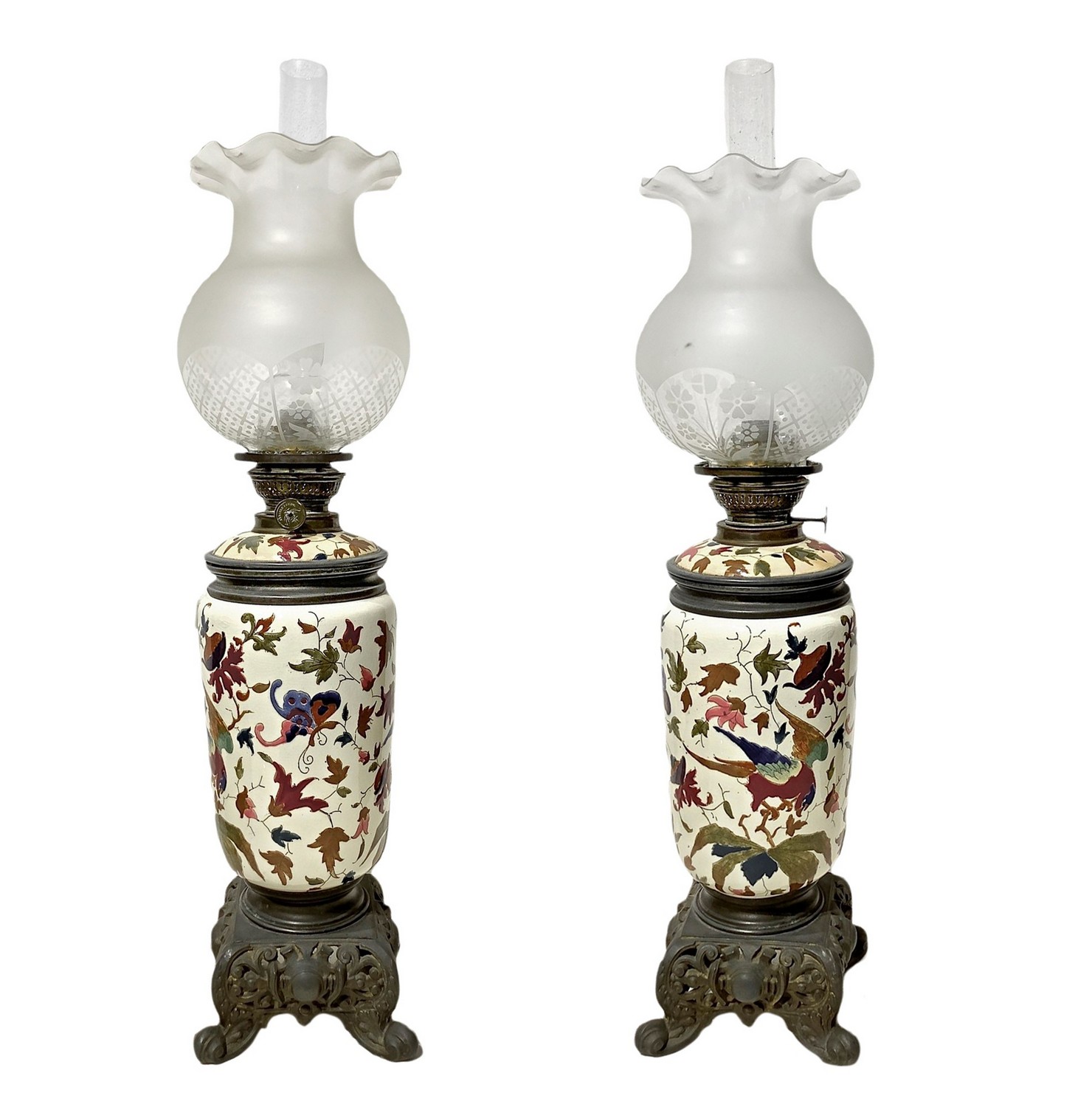 Coppia di lumi in maiolica. Boccia in vetro a tulipano, base in bronzo e decorazioni di fiori e uccelli XX secolo H 65 cm