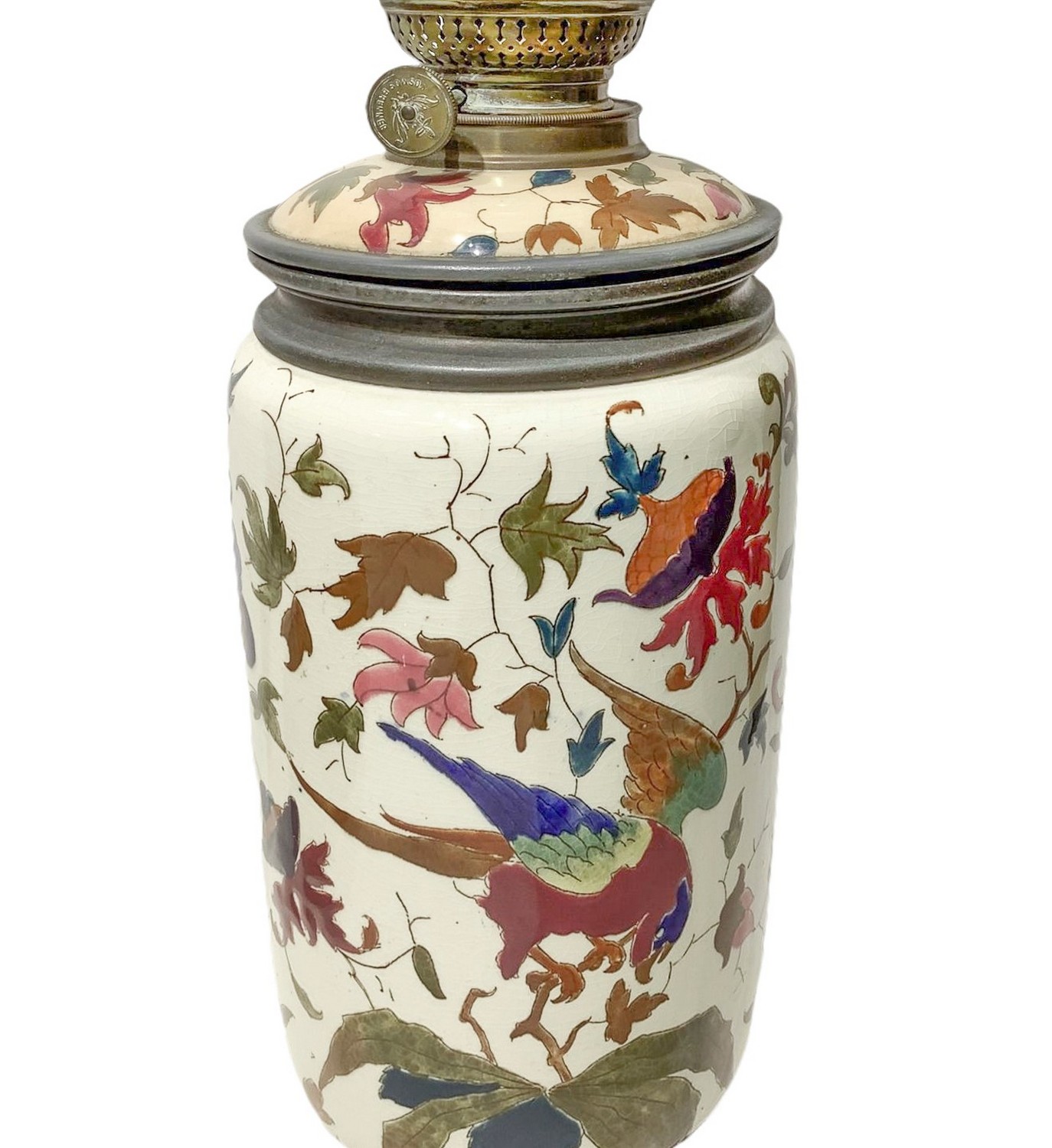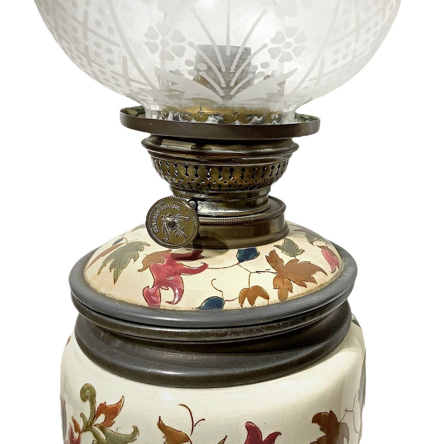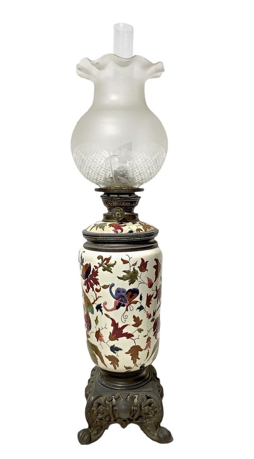 Coppia di lumi in maiolica. Boccia in vetro a tulipano, base in bronzo e decorazioni di fiori e uccelli XX secolo H 65 cm