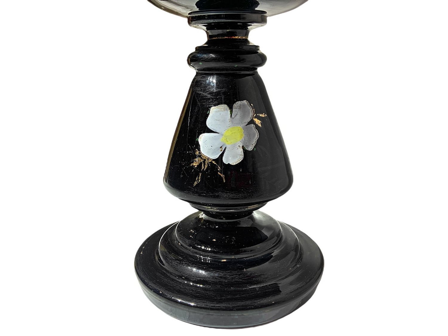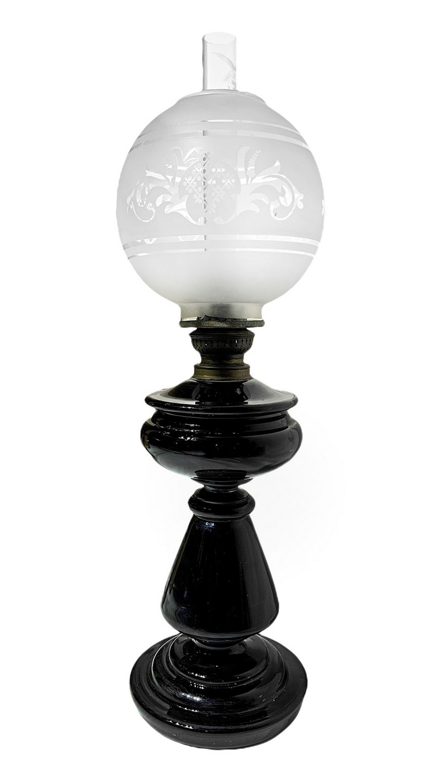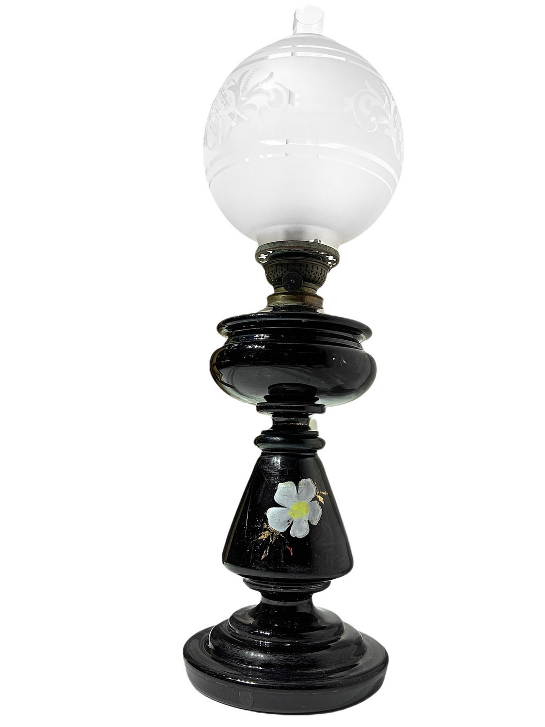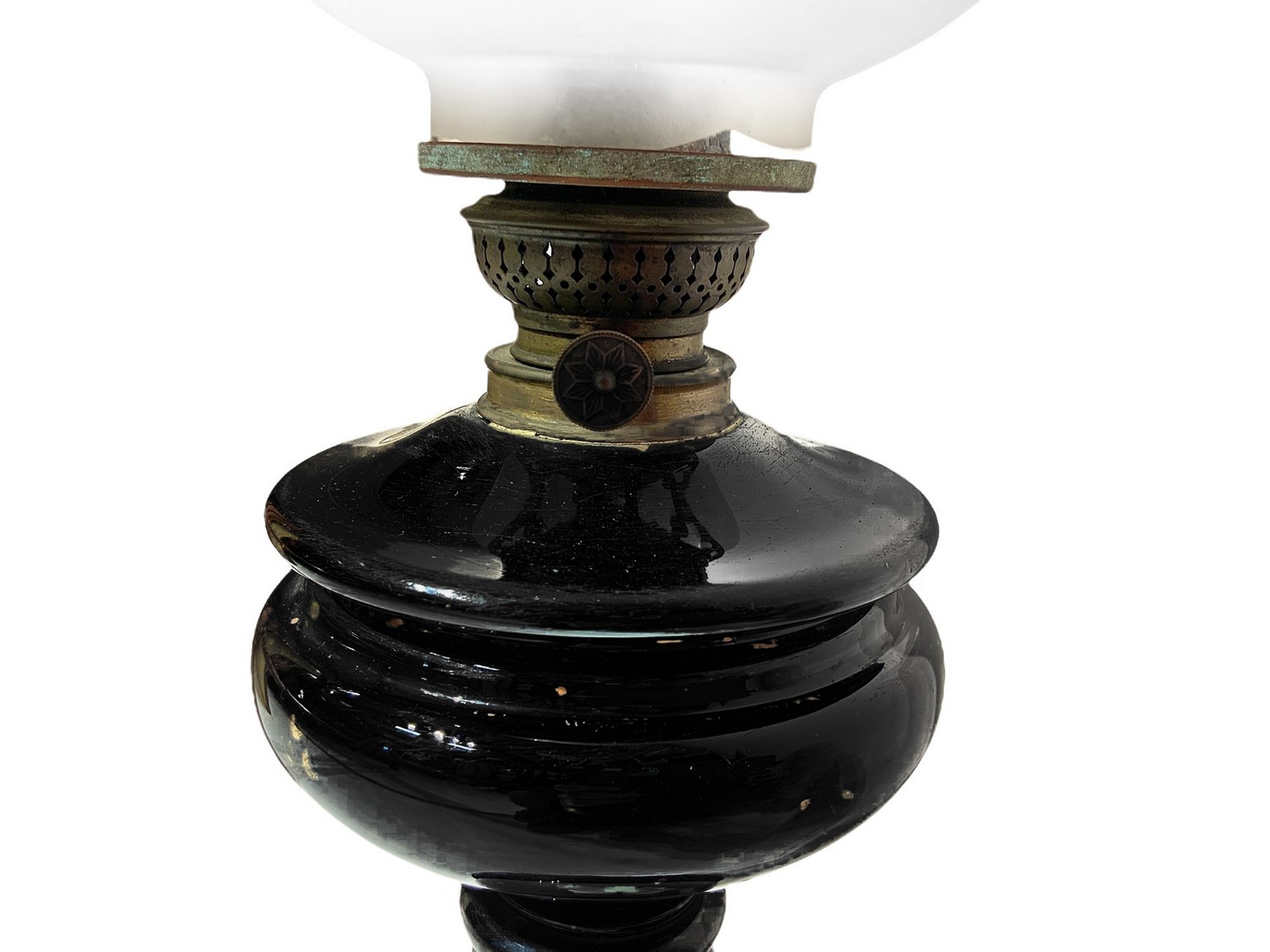 Lume a petrolio, in opaline nero e boccia in vetro. H 56 cm XIX/XX secolo