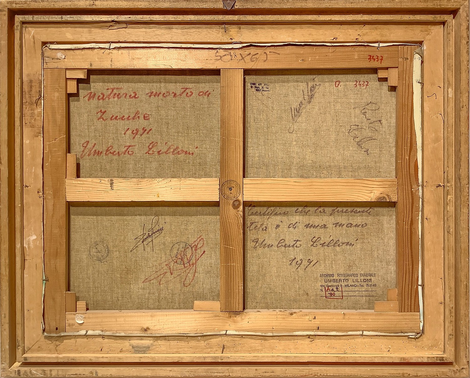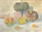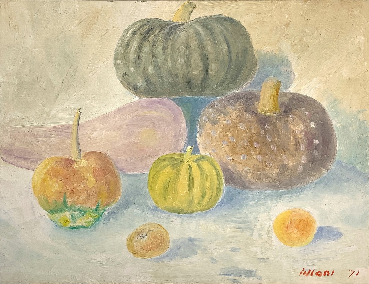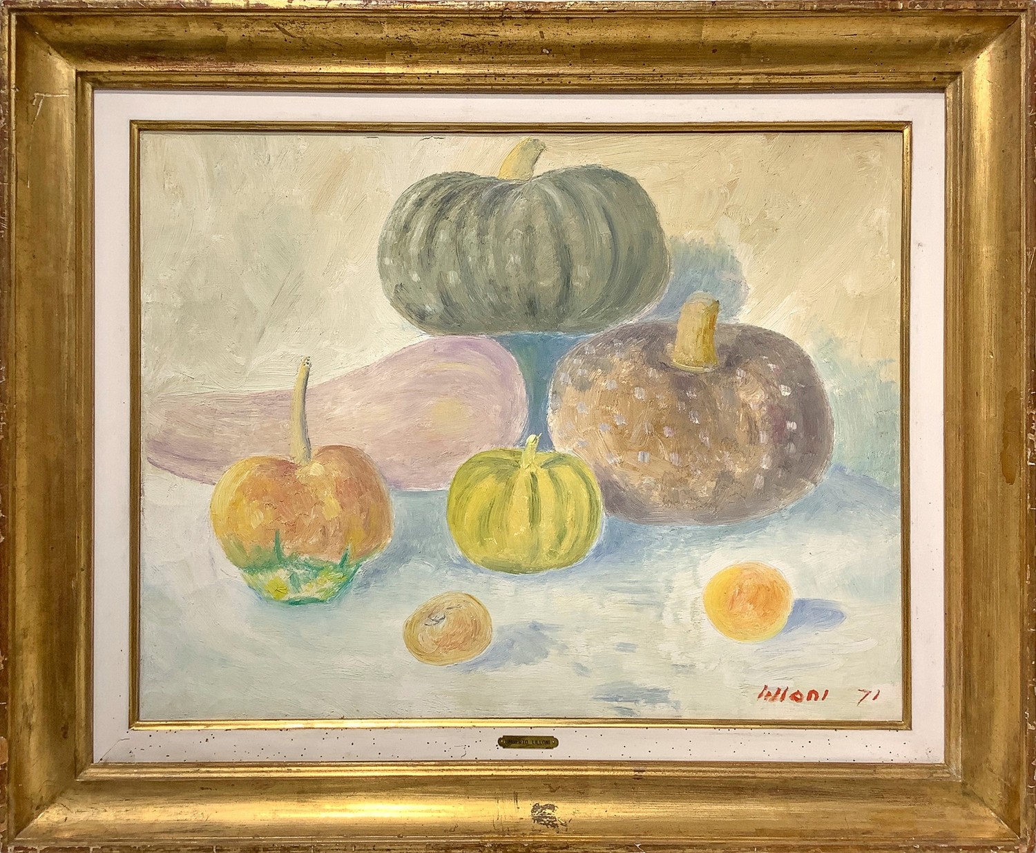 Natura morta di zucche.. Firmato in basso a detra Lilloni '71. Timbro dell'archivio sul retro, Archivio Fotografico Generale N. 90 Dipinto ad olio su tela 50x65 cm, in cornice di legno dorata 70x85 cm Umberto Lilloni Milano 1898-Milano 1980