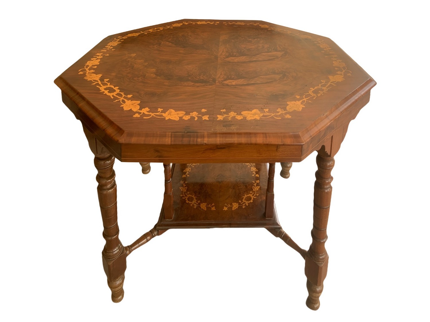 Tavolo ottagonale in legno di palissandro, piano in radica e sottopiano intarsiati.. H cm 67, lunghezza cm 87 H cm 67, lunghezza cm 87