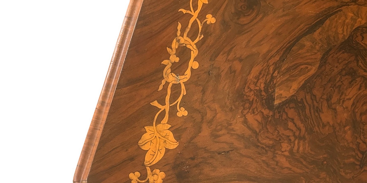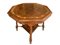 Tavolo ottagonale in legno di palissandro, piano in radica e sottopiano intarsiati.