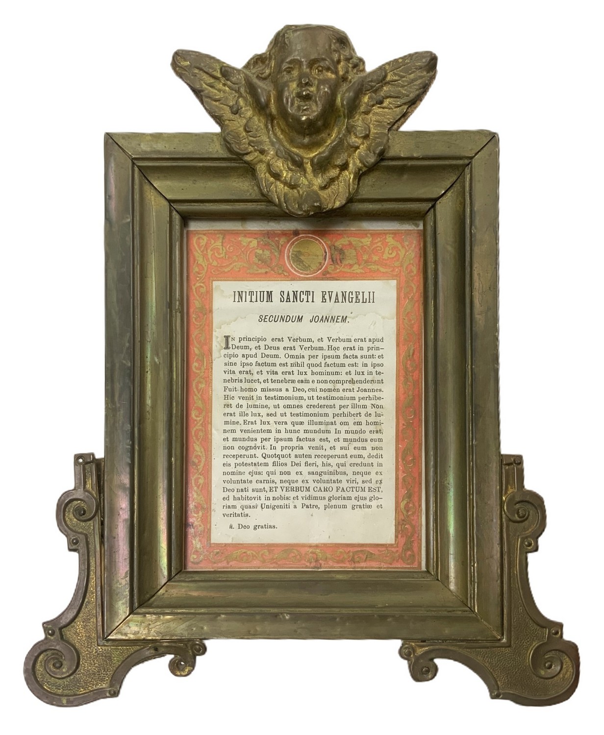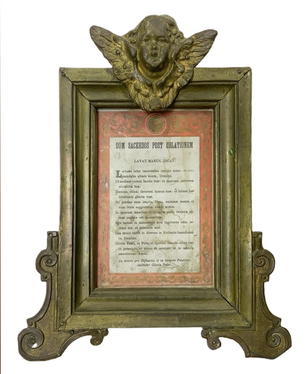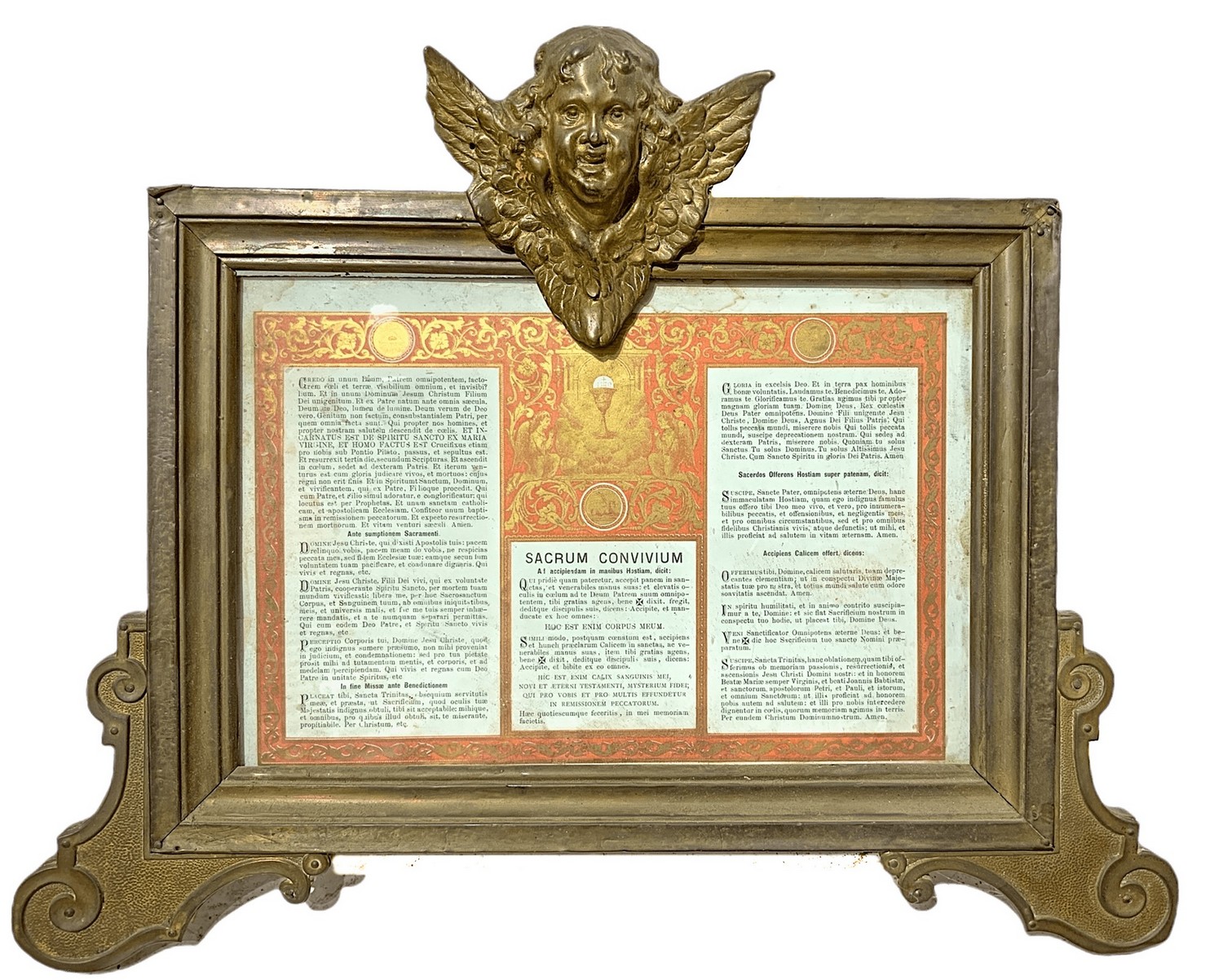 Trittico di cartaglorie in legno ricoperto da ottone con zefiri alati alla sommità. Presenza di difetti H 33x36 cm; Le due piccole H 26x17 cm XX secolo