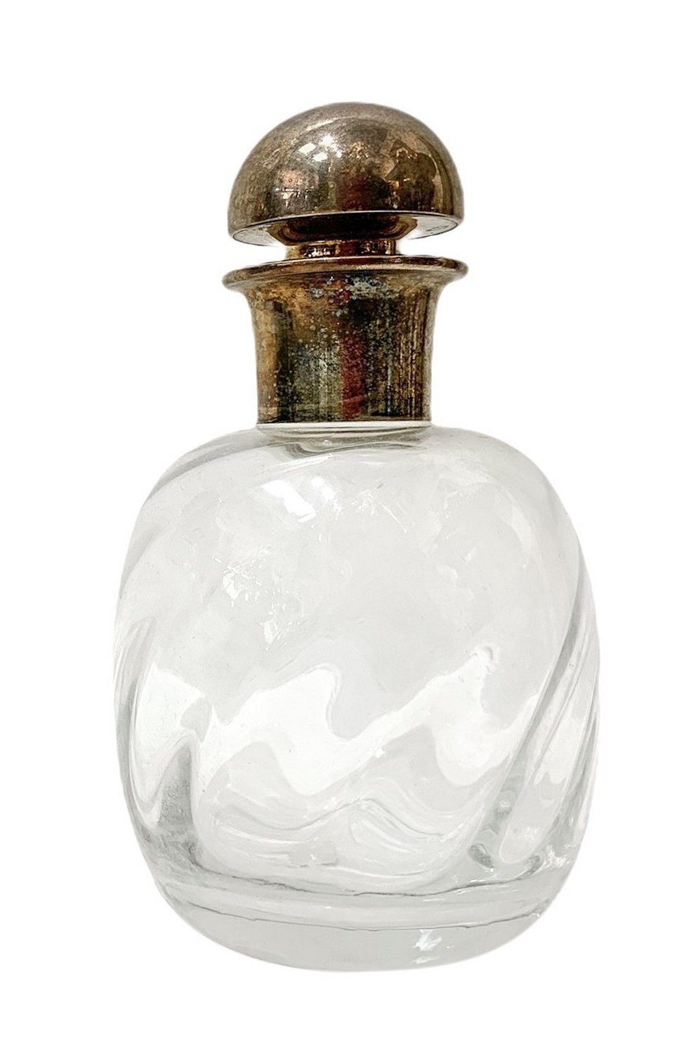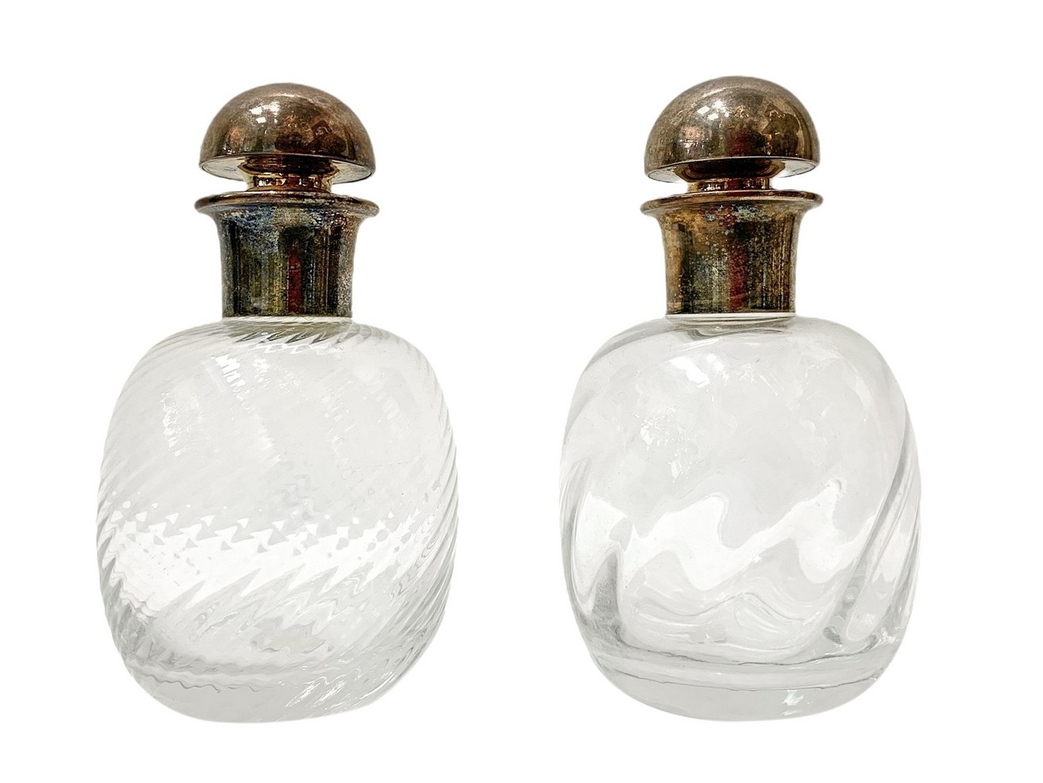 Coppia di bottiglie in vetro cordonato con tappo in metallo argentato, produzione Italia