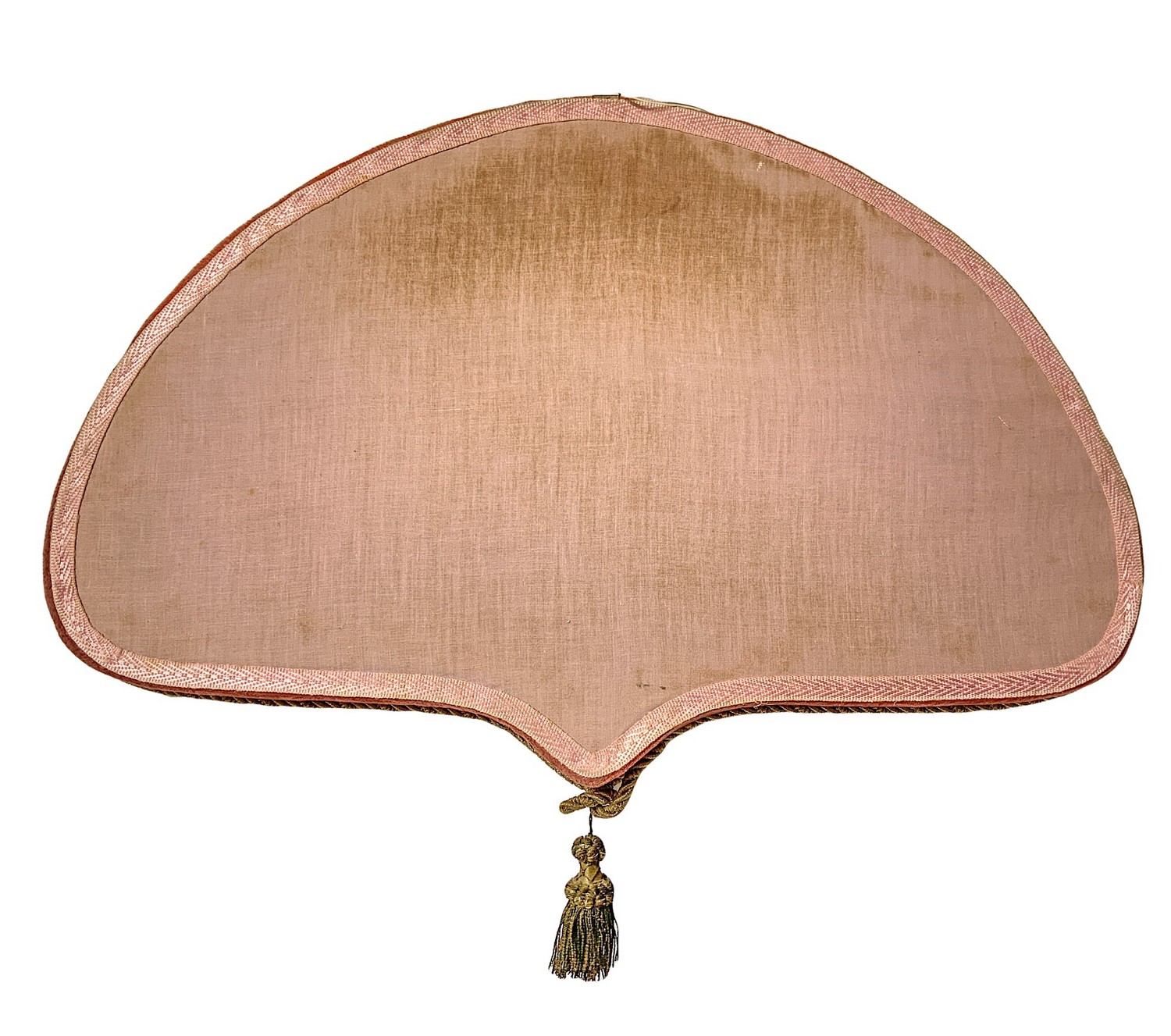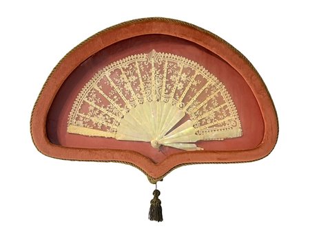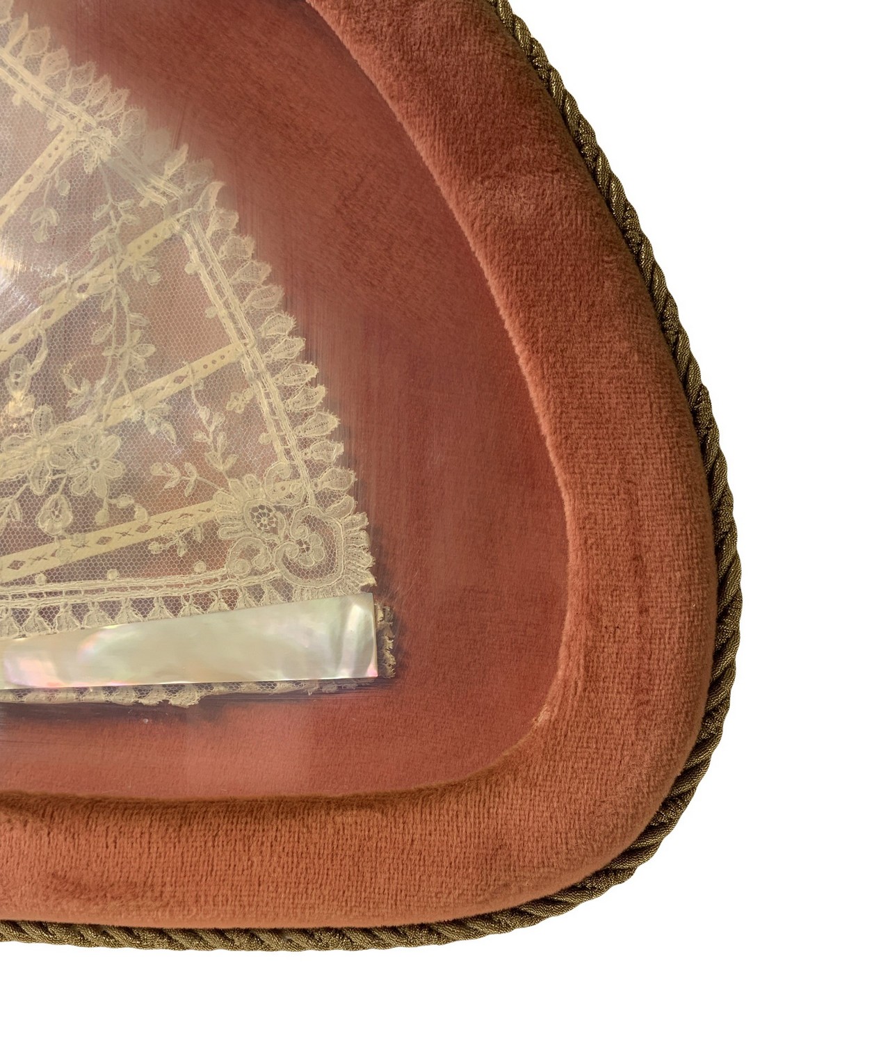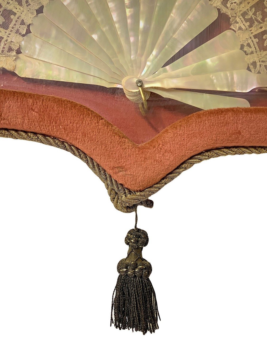 Ventaglio in merletto Chantilly. Stecche in madreperla, in ventagliera di velluto, colorsalmone 41x62 cm