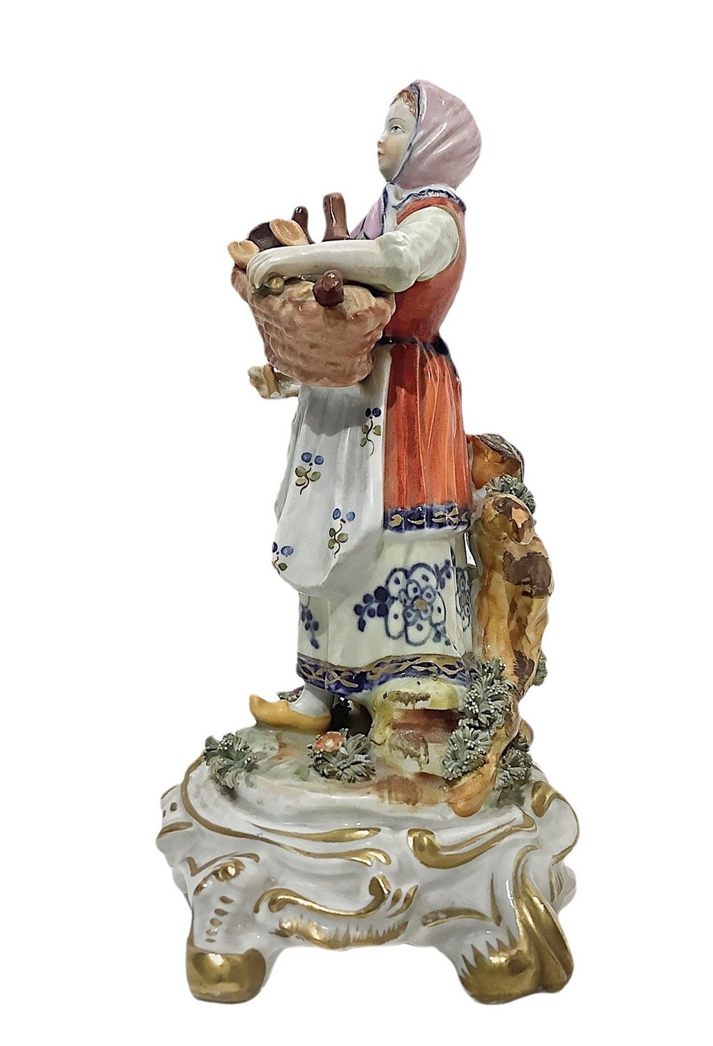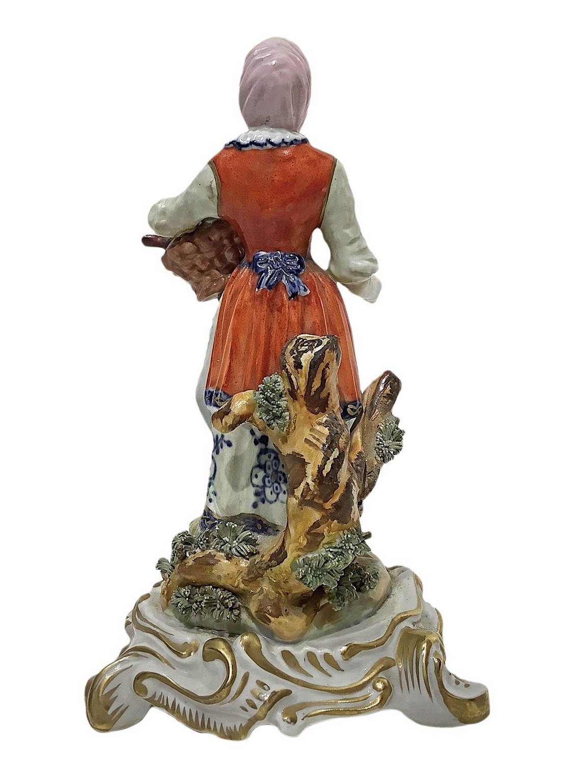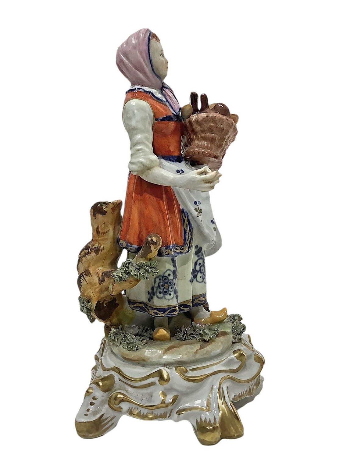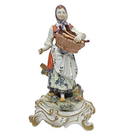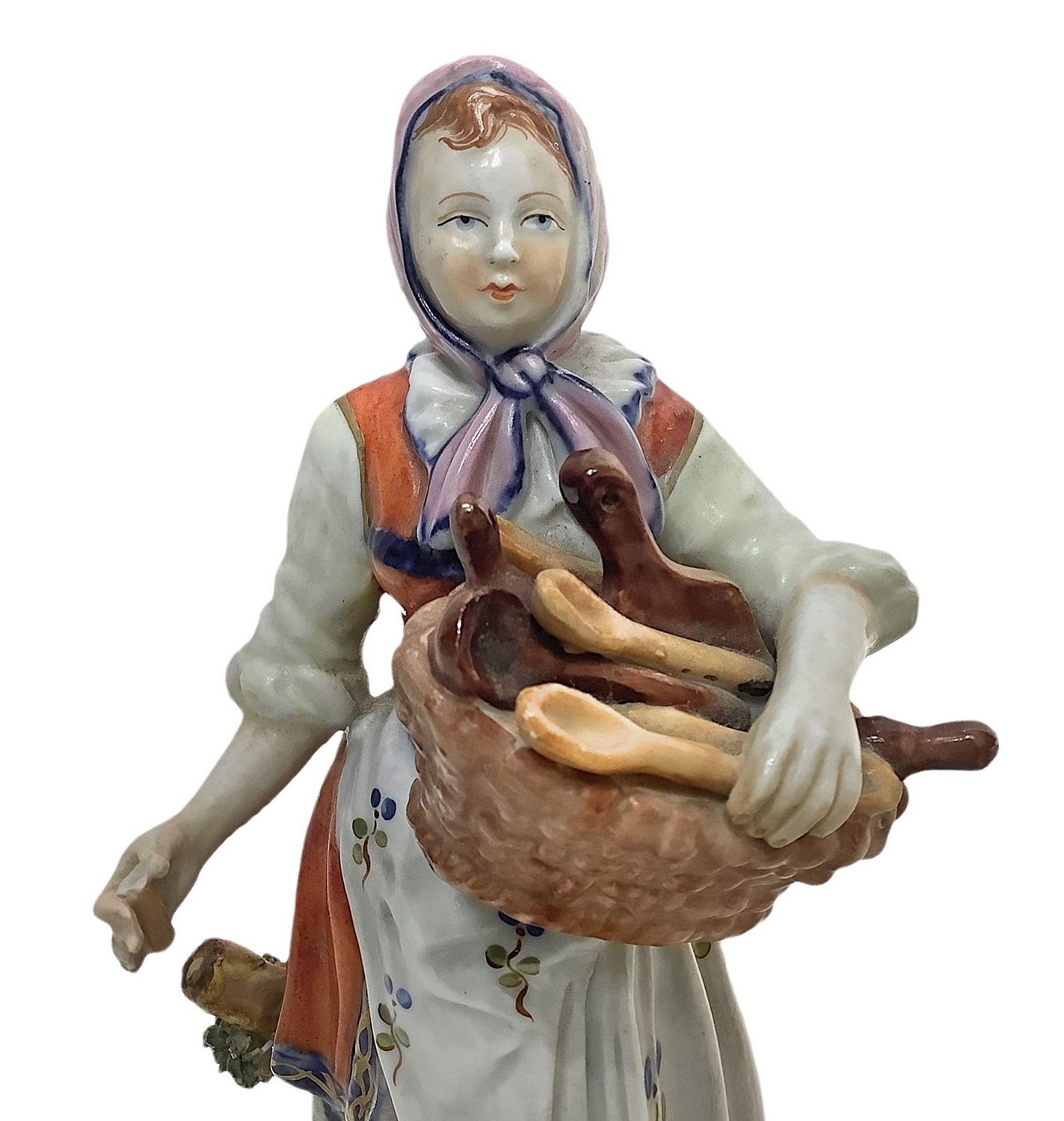 Statuina capodimonte raffigurante donna venditrice di cucchiai.. Presenta piccola mancanza H cm 21. Fine XIX secolo.