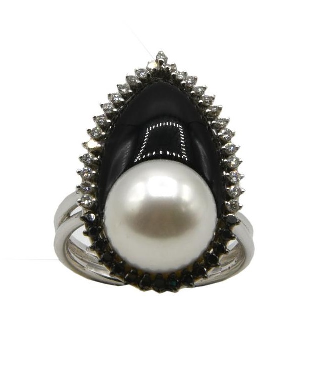 in oro bianco 18 kt con perla bianca australiana di 11 mm montata con onice a goccia di 1,80 gr. circa e circondati da diamanti taglio brillante per 0,41 ct circa.
