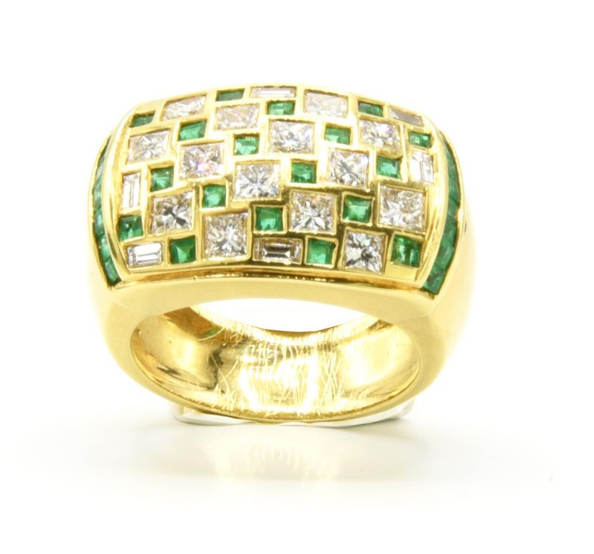 in oro giallo 18kt, con diamanti taglio brillante e rettangolare per 2,15 ct circa e smeraldi taglio carrè per 1,04 ct circa