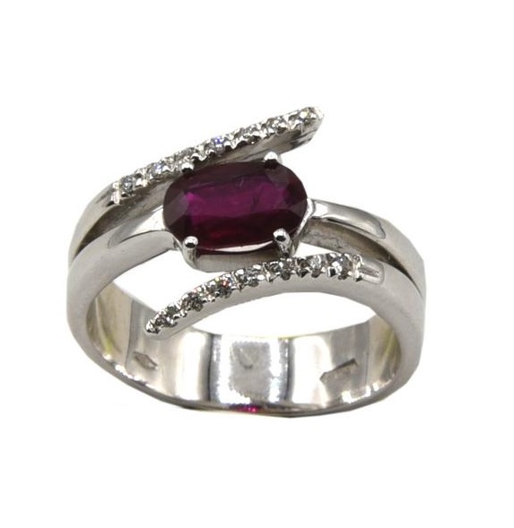 in oro bianco 18kt, con al centro rubino Birmano naturale, taglio ovale, si 1,08 ct circa, e diamanti per 0,16 ct circa