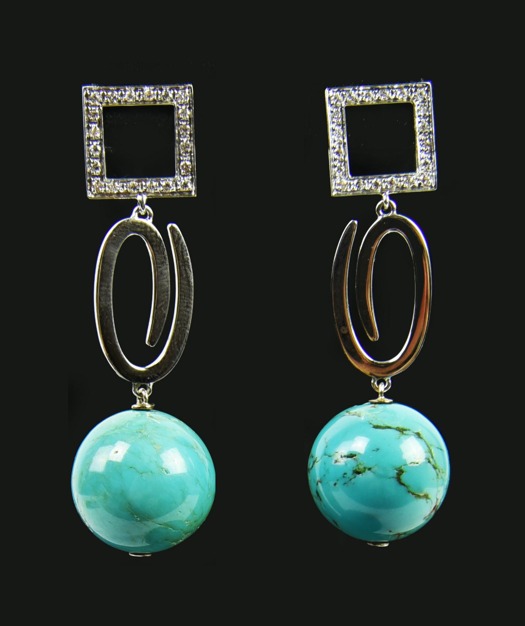 in oro bianco 18kt, con sfere di turchese persiano di 16-16,5 mm ed elementi geometrici decorati con diamanti taglio brillante per 0,20 ct circa.