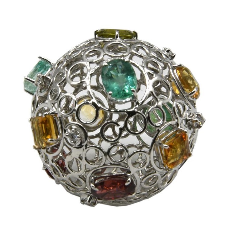 PENDENTE A SFERA TRAFORATA CON PERIDOTI, GRANATI E CITRINI in oro bianco...