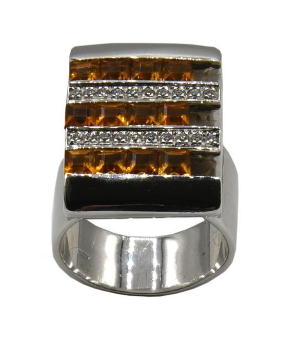 ANELLO CON CITRINI E DIAMANTI in oro bianco 18kt, con tre file di citrini...