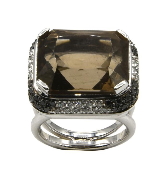 in oro bianco 18kt, con al centro quarzo fumè rettangolare, taglio composito, su una griffe impreziosita da un pavè di diamanti taglio brillante per 0,48 ct circa e diamanti neri per 0,27 ct circa.