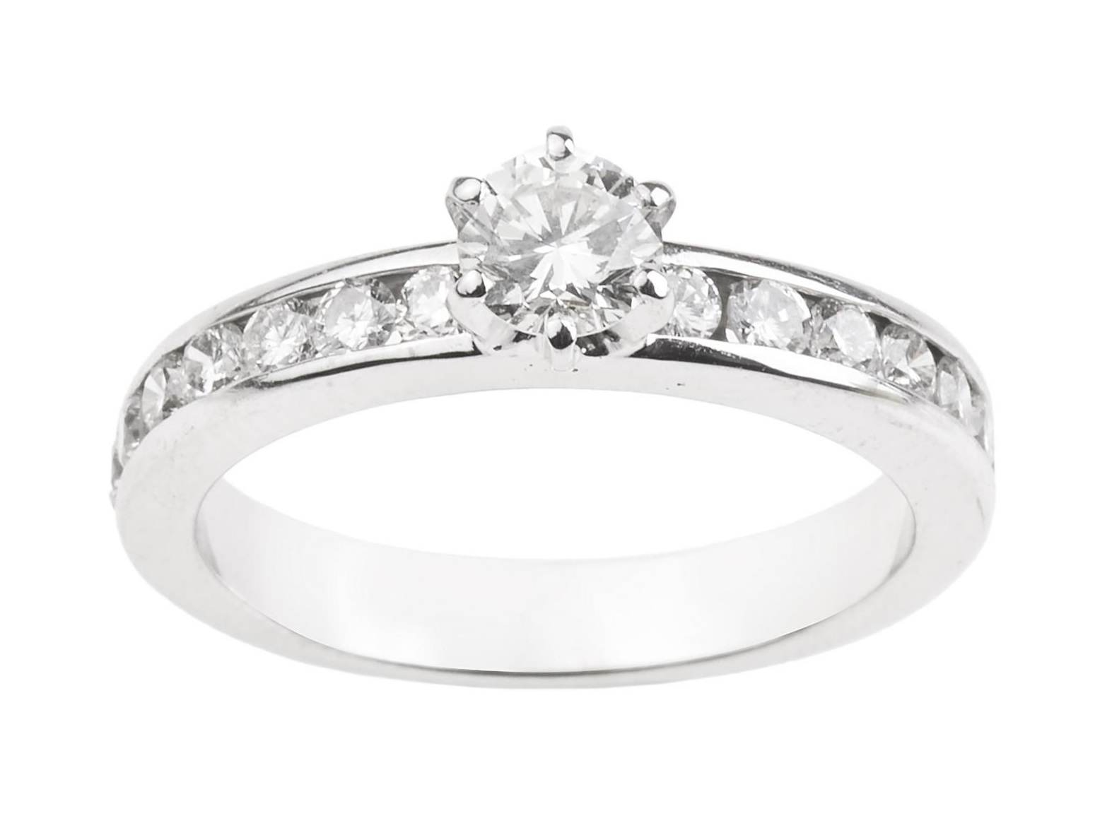 in oro bianco 18kt, al centro un diamante di forma rotonda a brillante di ct 0,45 circa, colore F/G, purezza VS/VVS, impreziosito ai lati da quattordici diamanti per ct 0,70 totali circa.