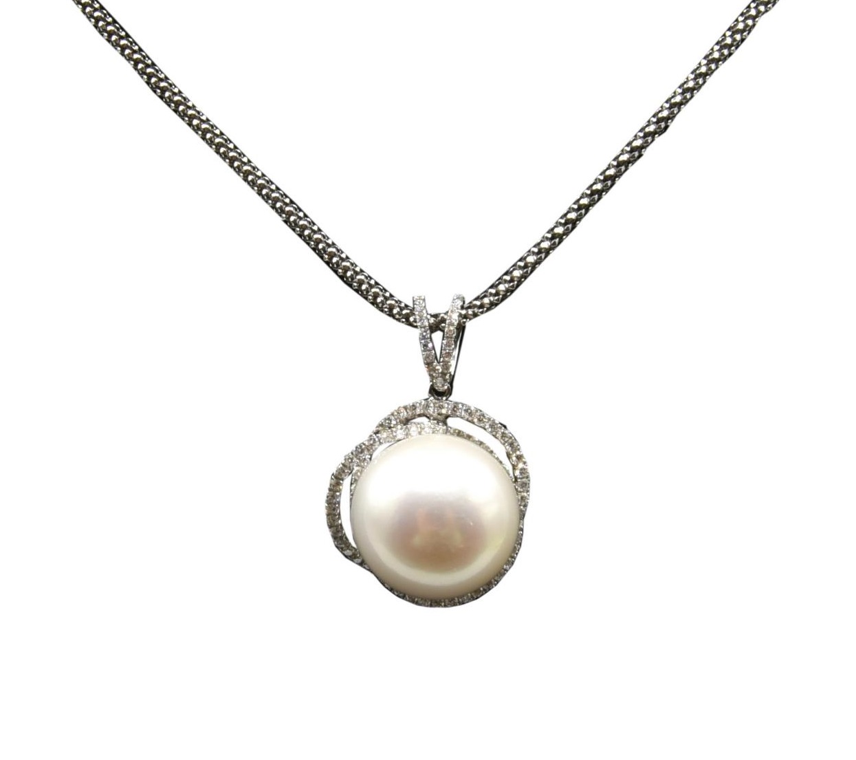 in oro bianco 18kt, con perla coltivata South Sea, colore bianco, di 15 mm e diamanti taglio brillante per 0,64 ct circa.