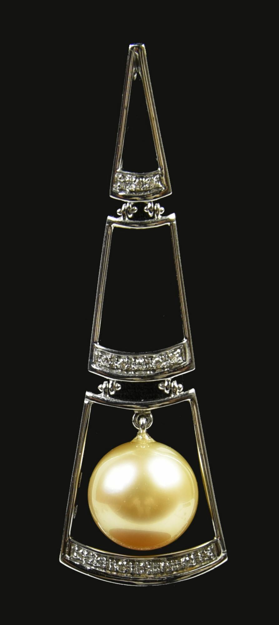 in oro bianco 18kt, con perla coltivata gold South Sea di 12,5 mm e diamanti per 0,13 ct circa.