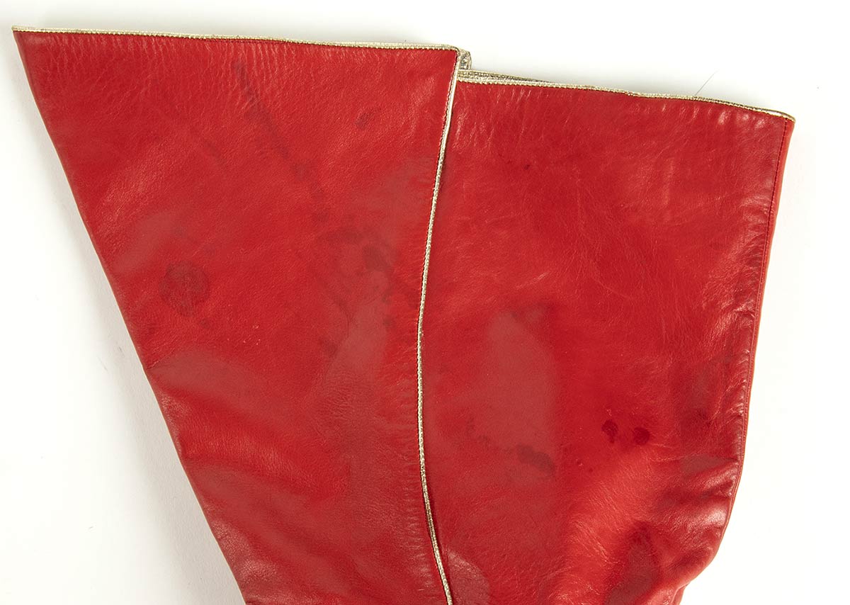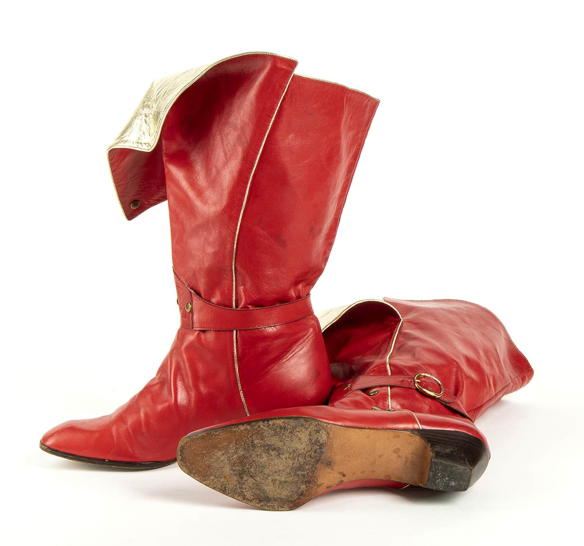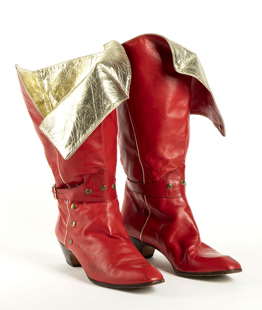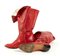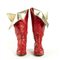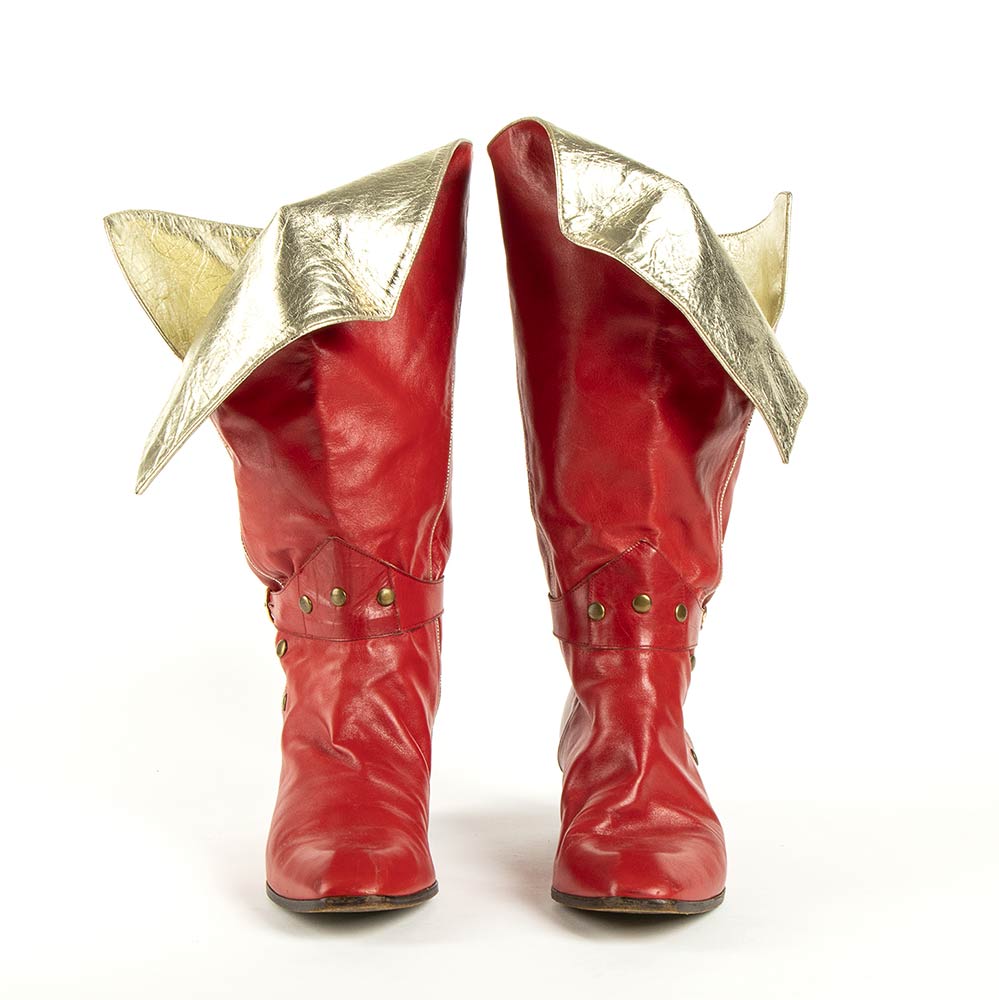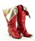 Stivaletto in pelle rossa e dorata, borchie e fibbie in metallo dorato