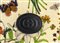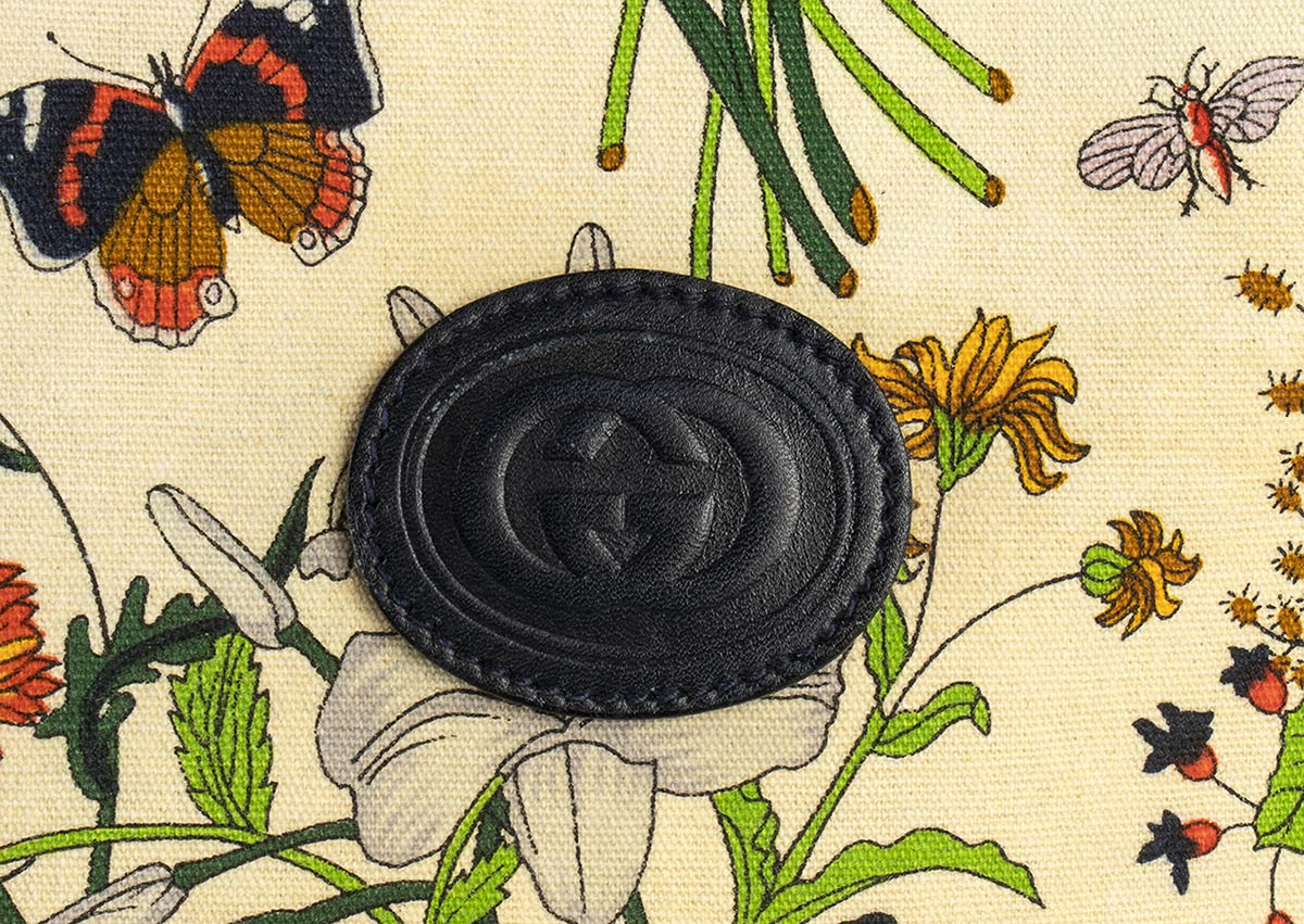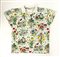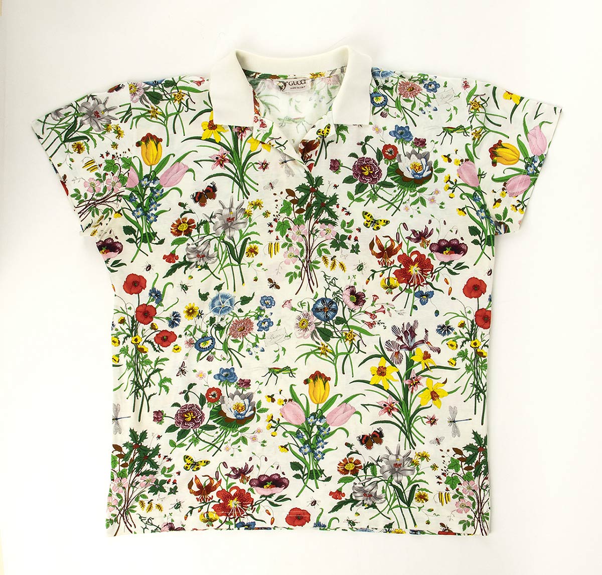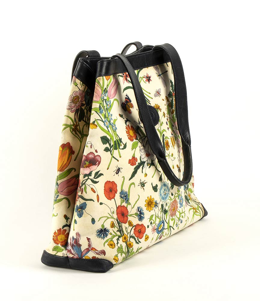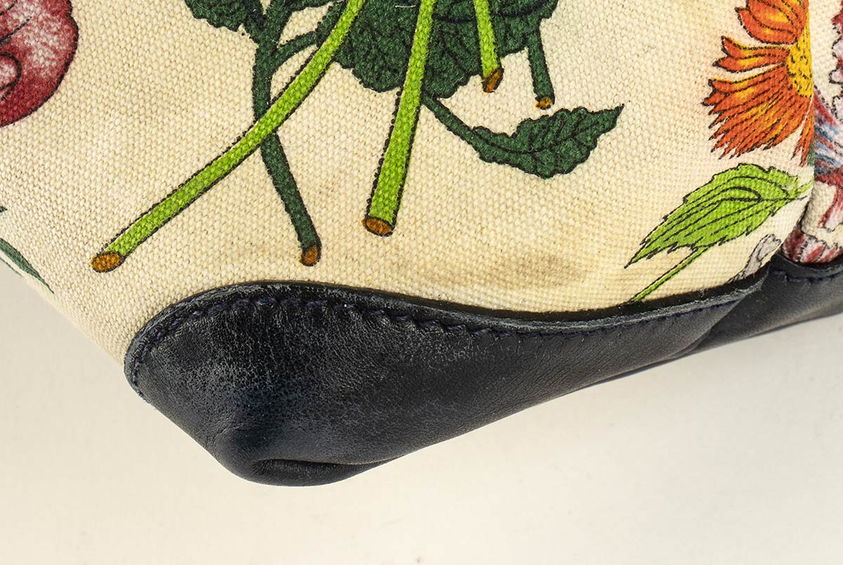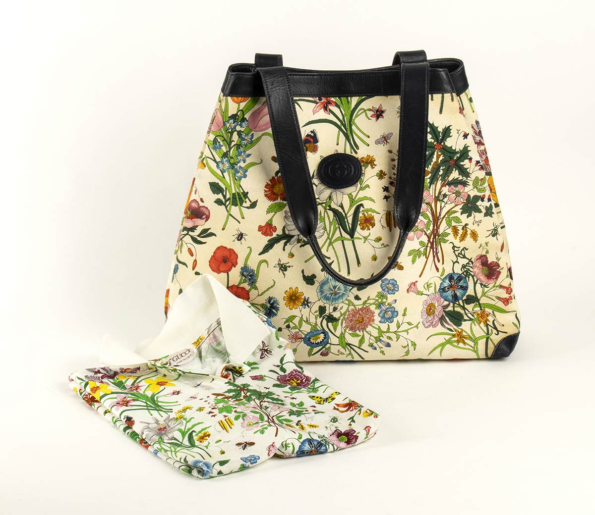 Lotto di 2 articoli : borsa in tela e pelle blu pattern Flora, grado di condizione generale C/D (segni di utilizzo, leggere macchie, perdita del rivestimento interno in simil pelle), maglietta in cotone pattern Flora