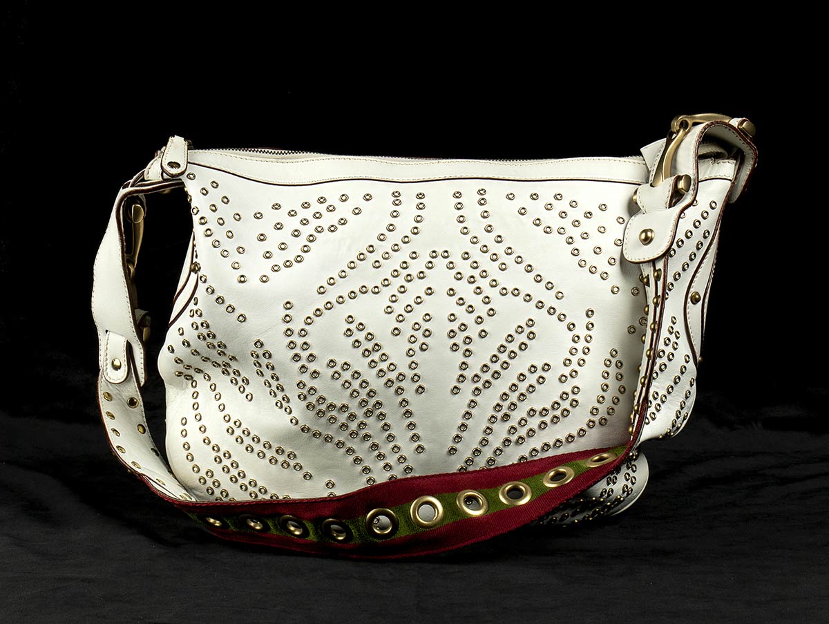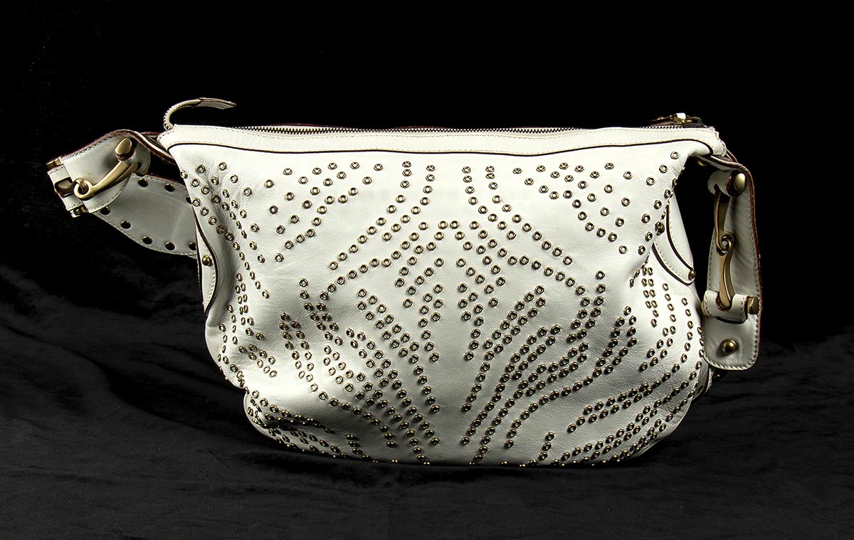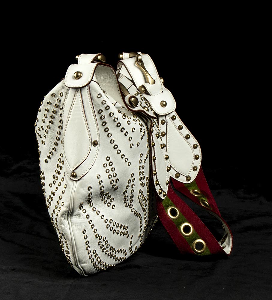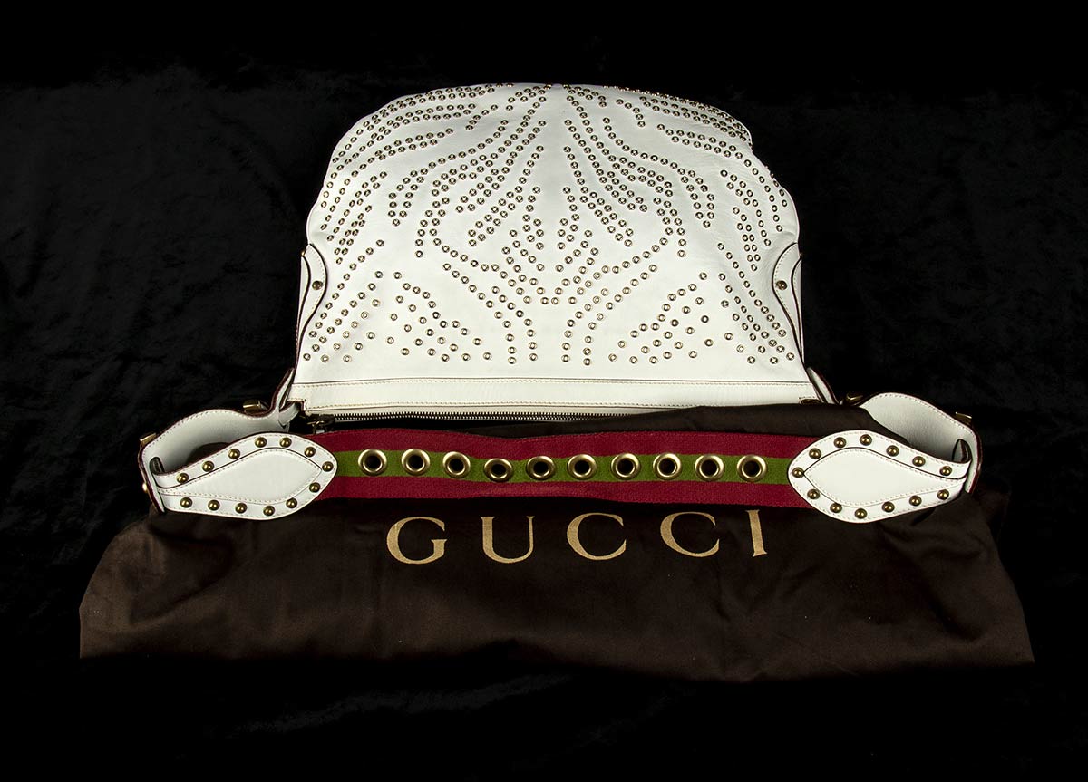 Borsa in pelle bianca lavorazione con borchie nastro web rosso e verde dust bag