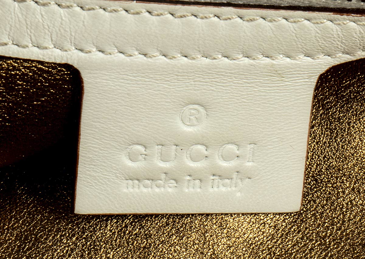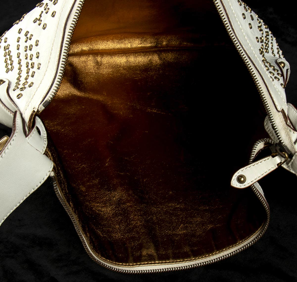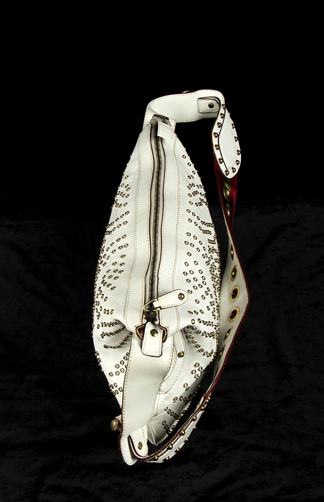 Borsa in pelle bianca lavorazione con borchie nastro web rosso e verde dust bag