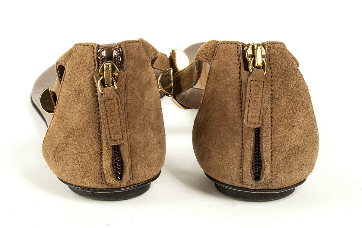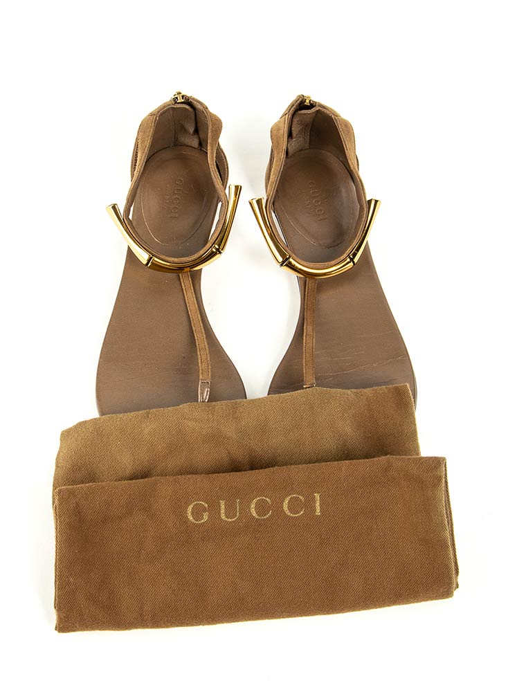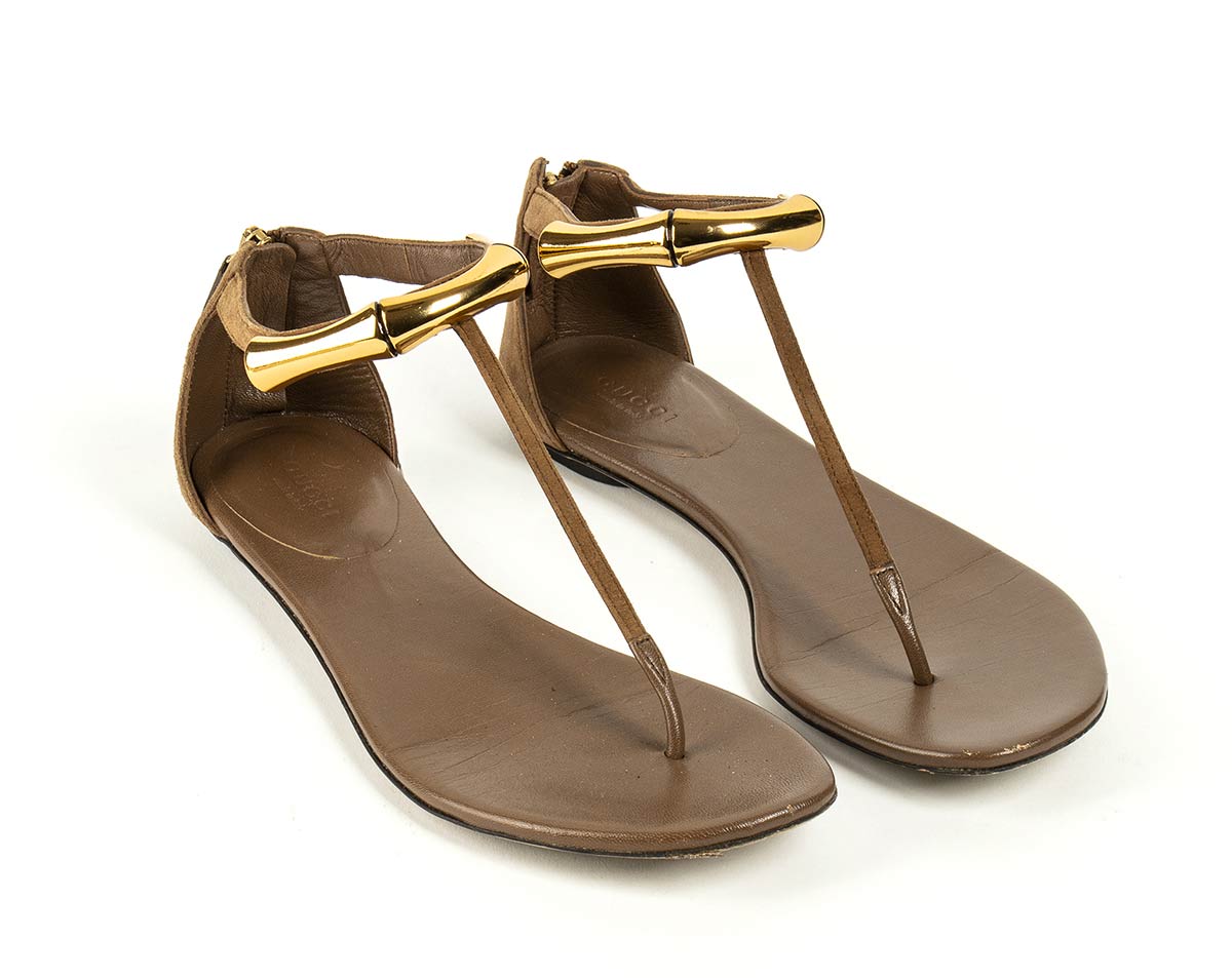 Sandalo ad infradito in camoscio marrone chiusura alla caviglia con dettaglio bamboo in metallo dorato dust bags tg 38