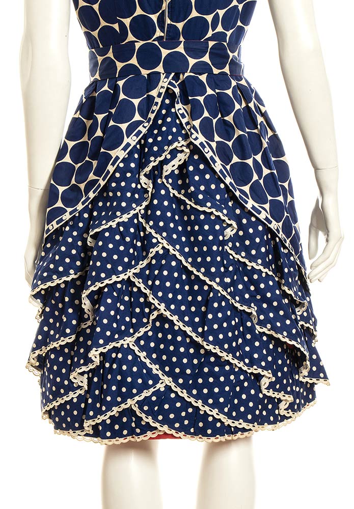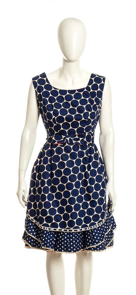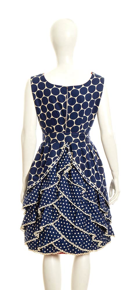 Abito in cotone blu e bianco pattern con pois grandi e piccoli, gonna con balze nel retro