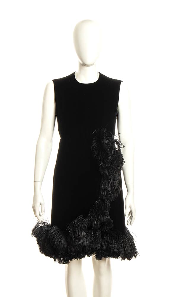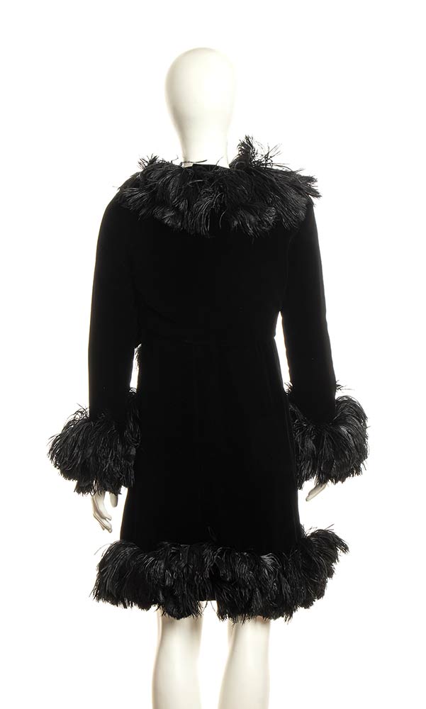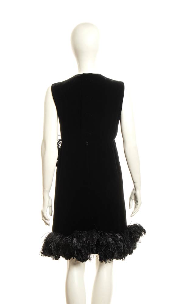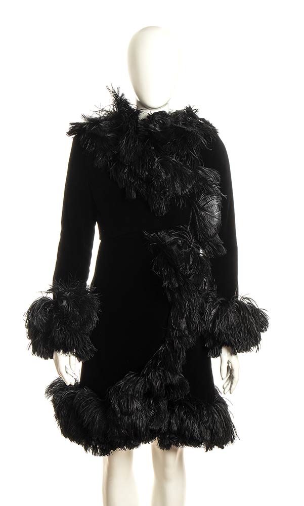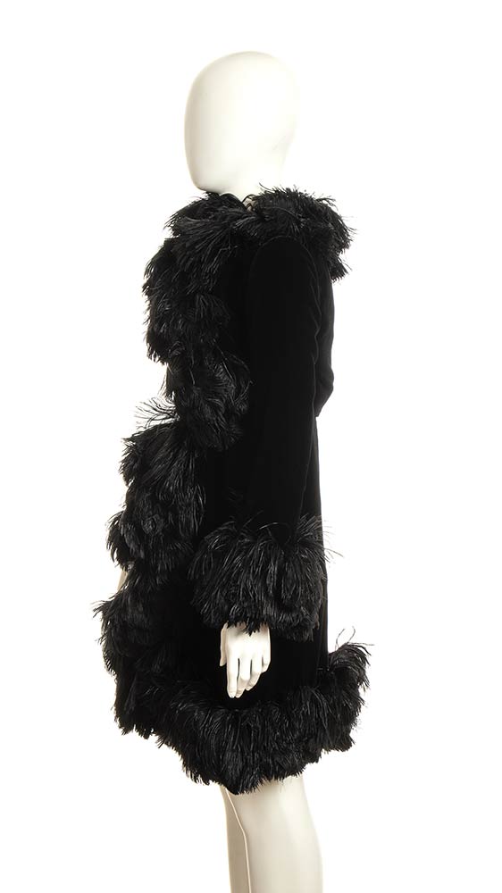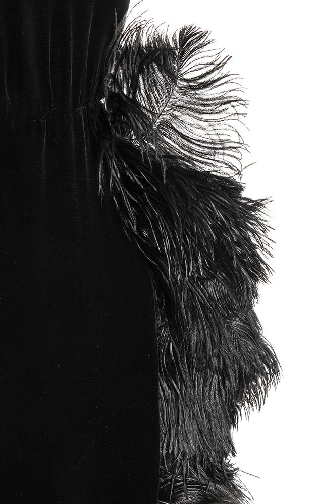 Completo (abito e bolero) in velluto nero e piume di struzzo